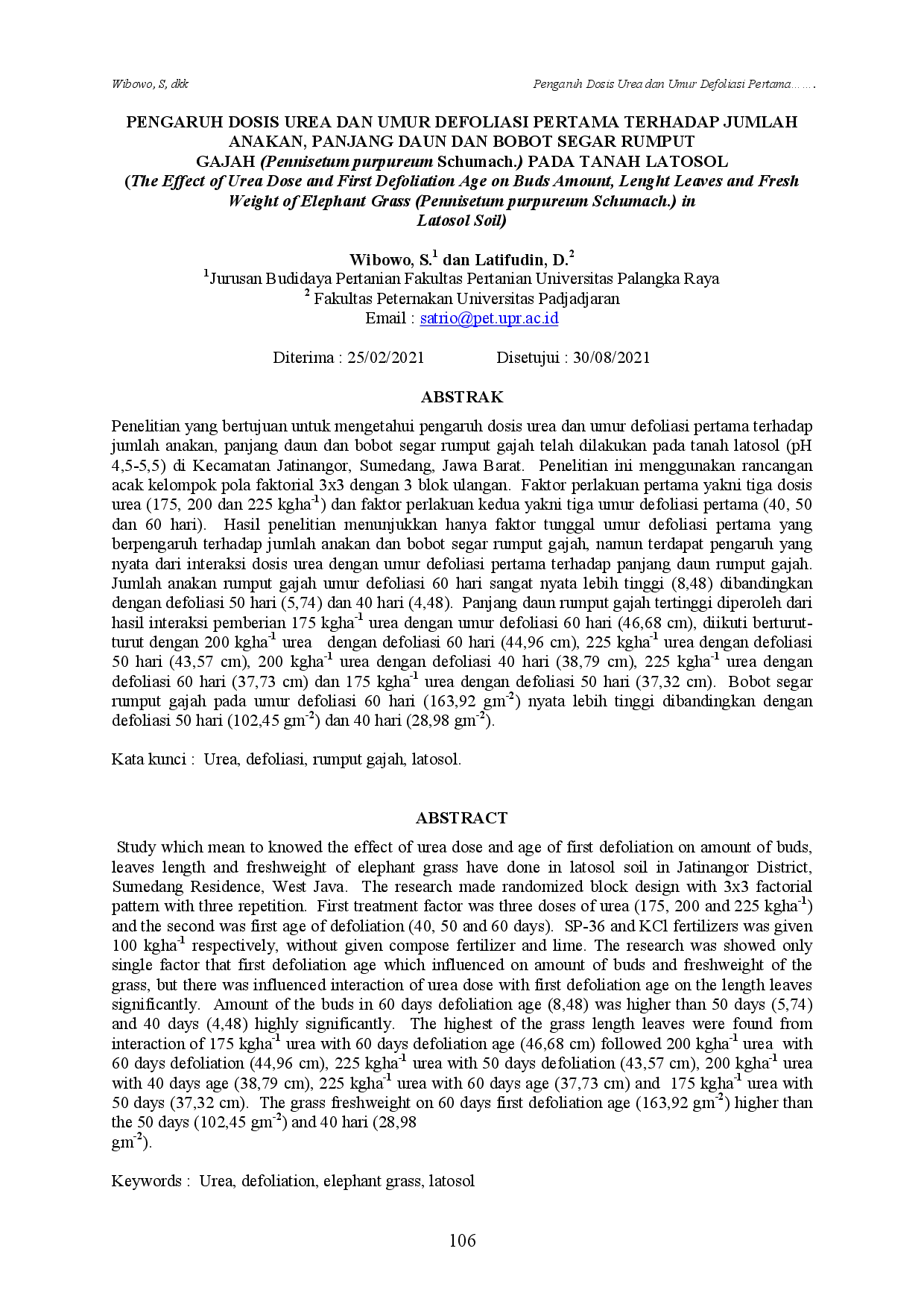 AgriPeatAgriPeatPenelitian yang bertujuan untuk mengetahui pengaruh dosis urea dan umur defoliasi pertama terhadap jumlah anakan, panjang daun dan bobot segar rumput gajah telah dilakukan pada tanah latosol (pH 4,5-5,5) di Kecamatan Jatinangor, Sumedang, Jawa Barat. Penelitian ini menggunakan rancangan acak kelompok pola faktorial 3x3 dengan 3 blok ulangan. Faktor perlakuan pertama yakni tiga dosis urea (175, 200 dan 225 kg ha-1) dan faktor perlakuan kedua yakni tiga umur defoliasi pertama (40, 50 dan 60 hari). Hasil penelitian menunjukkan hanya faktor tunggal umur defoliasi pertama yang berpengaruh terhadap jumlah anakan dan bobot segar rumput gajah, namun terdapat pengaruh yang nyata dari interaksi dosis urea dengan umur defoliasi pertama terhadap panjang daun rumput gajah. Jumlah anakan rumput gajah umur defoliasi 60 hari sangat nyata lebih tinggi (8,48) dibandingkan dengan defoliasi 50 hari (5,74) dan 40 hari (4,48). Panjang daun rumput gajah tertinggi diperoleh dari hasil interaksi pemberian 175 kg ha-1 urea dengan umur defoliasi 60 hari (46,68 cm), diikuti berturut-turut dengan 200 kg ha-1 urea dengan defoliasi 60 hari (44,96 cm), 225 kg ha-1 urea dengan defoliasi 50 hari (43,57 cm), 200 kg ha-1 urea dengan defoliasi 40 hari (38,79 cm), 225 kg ha-1 urea dengan defoliasi 60 hari (37,73 cm) dan 175 kg ha-1 urea dengan defoliasi 50 hari (37,32 cm). Bobot segar rumput gajah pada umur defoliasi 60 hari (163,92 g m-2) nyata lebih tinggi dibandingkan dengan defoliasi 50 hari (102,45 g m-2) dan 40 hari (28,98 g m-2).