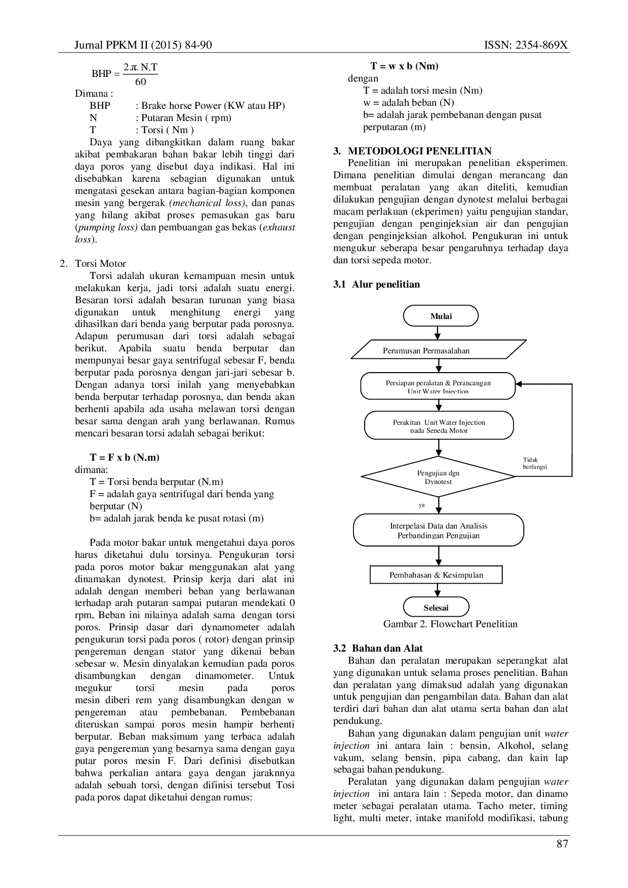 Jurnal Penelitian dan Pengabdian Kepada Masyarakat UNSIQJurnal Penelitian dan Pengabdian Kepada Masyarakat UNSIQModifikasi sistem dan komponen dari kondisi mesin standar banyak dilakukan dengan tujuan untuk meningkatkan performa kendaraan bermotor. Demikian juga dengan penambahan sistem penginjeksian air (water injection system) ke dalam intake manifold ini bertujuan untuk mengetahui pengaruh perubahan daya dan torsi terhadap motor. Penelitian ini menggunakan pendekatan experiment dengan model penelitian research and development. Dimana obyek penelitian berupa sepeda motor supra fit dilakukan beberapa pengujian dengan variabel bebas kondisi standar, kondisi penambahan injeksi air, dan kondisi injeksi alkohol. Kemudian dilakukan pengujian terhadap daya dan torsi dengan menggunakan dynotest. Hasil penelitian didapatkan bahwa pengujian torsi dan daya mesin adalah pada kondisi standar sebesar 6,85 N.M (5782 rpm) dan 6,5 HP (8981 rpm). Kondisi penginjeksian air sebesar 7,13 N.M (5850 rpm) dan 6.5 HP (6969 rpm), sedangkan pada kondisi penginjeksian alkohol 7.12 N.M (5808 rpm) dan 6.5 HP (7227 rpm). Penggunaan water injection mampu meningkatkan torsi, akan tetapi tidak untuk daya motor. Peningkatan torsi tersebut sebesar 4,09 % untuk penginjeksian dengan air, dan 4,23 % untuk penginjeksian dengan alkohol. Sedangkan waktu akselerasi dari motor meningkat sebesar 45,7% untuk penginjeksian dengan air dan 39,9% untuk penginjeksian dengan alkohol.