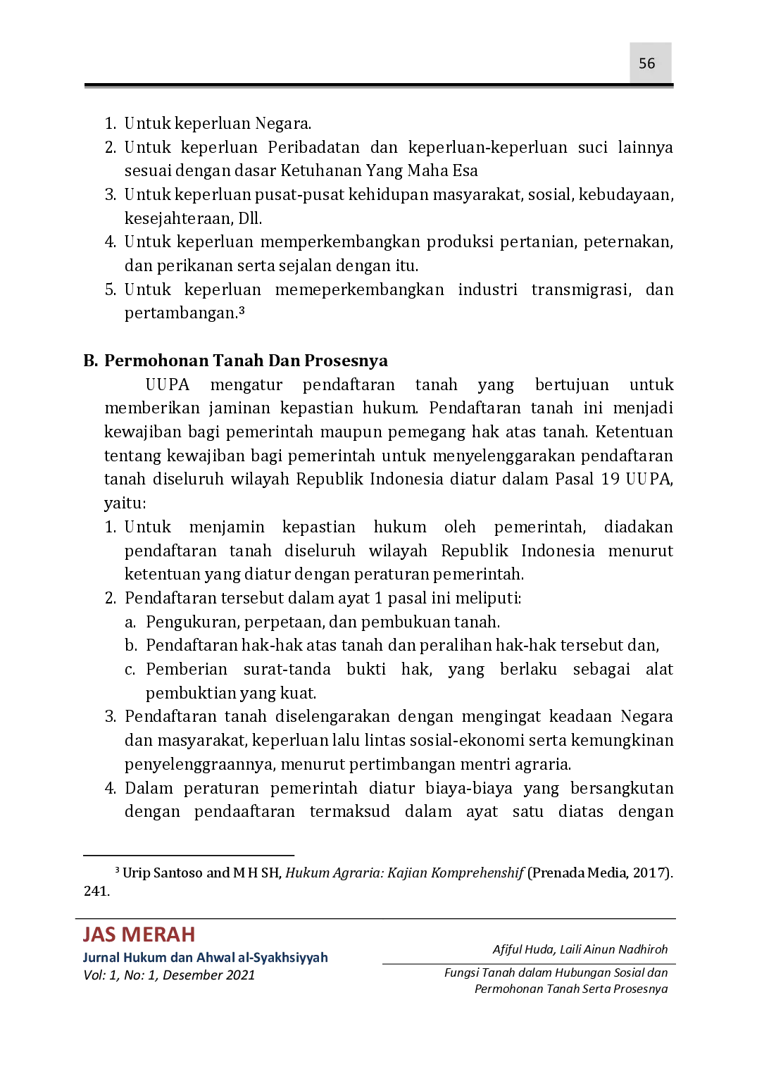 JAS MERAH: Jurnal Hukum dan Ahwal al-SyakhsiyyahJAS MERAH: Jurnal Hukum dan Ahwal al-SyakhsiyyahTanah memiliki peran yang sangat penting dalam kehidupan bangsa Indonesia dan dalam pelaksanaan pembangunan nasional yang diselenggarakan sebagai upaya berkelanjutan untuk mewujudkan masyarakat yang adil dan makmur berdasarkan Pancasila dan Undang-Undang Dasar 1945. Maka pengaturan penguasaan, pemilikan dan penggunaan tanah perlu lebih diarahkan lagi bagi semakin terjaminnya tertib di bidang hukum pertanahan, administrasi pertanahan, penggunaan tanah, ataupun pemeliharaan tanah dan lingkungan hidup, sehingga adanya kepastian hukum di bidang pertanahan pada umumnya dapat terwujud, sehubungan dengan itu dipandang perlu untuk menetapkan ketentuan-ketentuan lebih lanjut mengenai Hak Guna Usaha, Hak Guna Bangunan dan Hak Pakai sebagaimana dimaksud dalam Bab II Undang-Undang Nomor 5 Tahun 1960 dengan Peraturan Pemerintah. Mengingat: 1. Pasal 5 ayat (2) Undang-Undang Dasar 1945; 2. Undang-Undang Nomor 28 Tahun 1956 tentang Pengawasan Terhadap Penindakan Hak Atas Tanah Perkebunan (Lembaran Negara Tahun 1956 Nomor 73, Tambahan Lembaran Negara Nomor 1125).