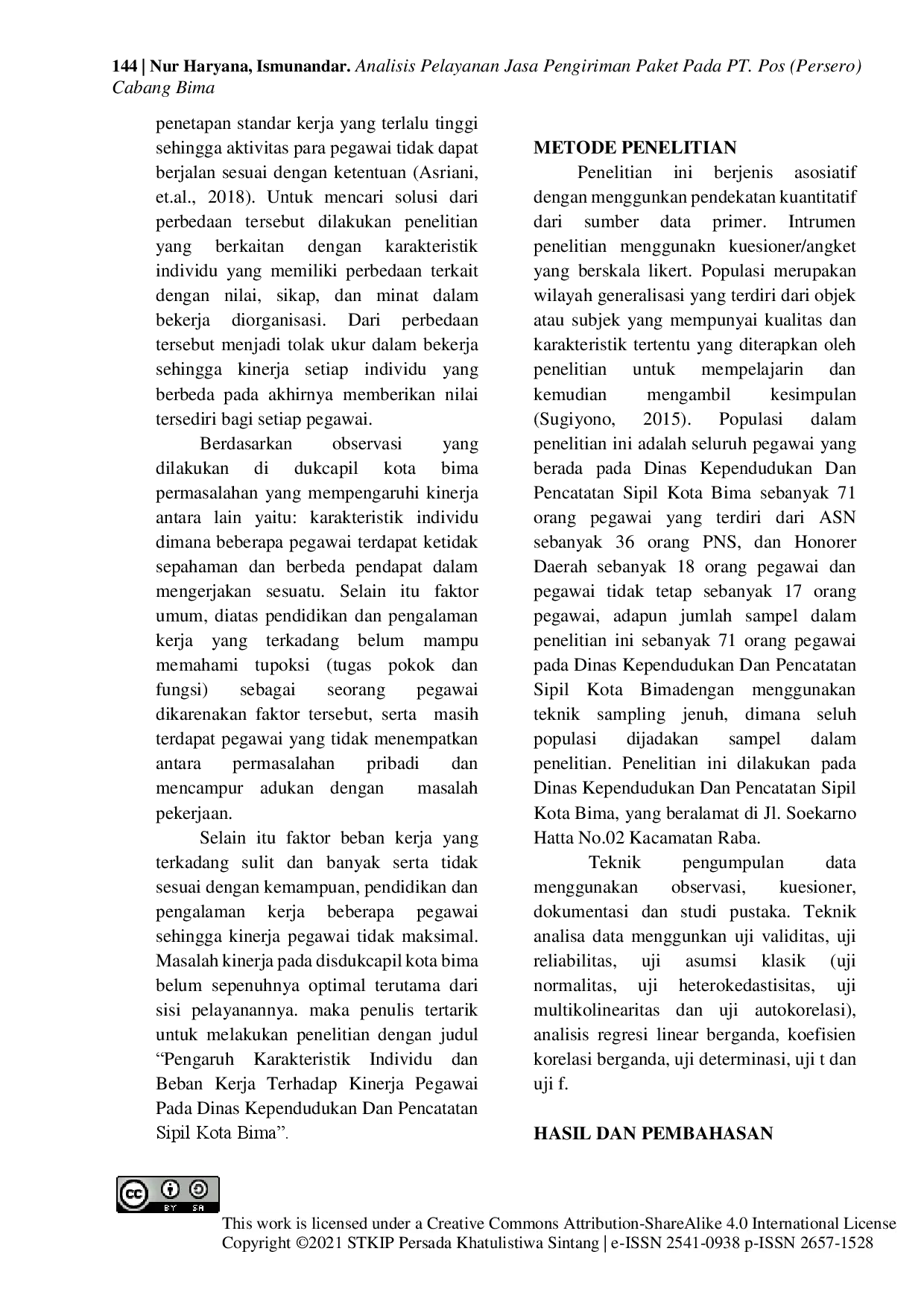 Jurnal Pendidikan Ekonomi (JURKAMI)Jurnal Pendidikan Ekonomi (JURKAMI)Penelitian ini bertujuan untuk mengetahui dan menganalisis . Jenis penelitian yang digunakan yaitu asosiatif dengan pendekatan kuantitatif dari sumber data primer. Instrumen penelitian menggunakan kuesioner dengan skala likert. Populasi dalam penelitian ini adalah seluruh pegawai yang berada pada Dinas Kependudukan dan Pencatatan Sipil Kota Bima sebanyak 71 orang pegawai, adapun sampel dalam penelitian ini menggunakan teknik sampling jenuh. Teknik pengumpulan data menggunakan observasi, kuesioner, dokumentasi dan studi pustaka. Teknik analisa data menggunakan statistik. Hasil penelitian menunjukan bahwa secara parsial karakteristik individu berpengaruh secara signifikan terhadap kinerja pegawai pada Dinas Kependudukan dan Pencatatan Sipil Kota Bima sedangkan beban kerja tidak berpengaruh signifikan terhadap kinerja pegawai pada Dinas Kependudukan dan Pencatatan Sipil Kota Bima, secara simultan karakteristik individu dan beban kerja tidak berpengaruh signifikan terhadap kinerja pegawai pada Dinas Kependudukan dan Pencatatan Sipil Kota Bima dengan tingkat hubungan rendah yaitu sebesar 6,6%.