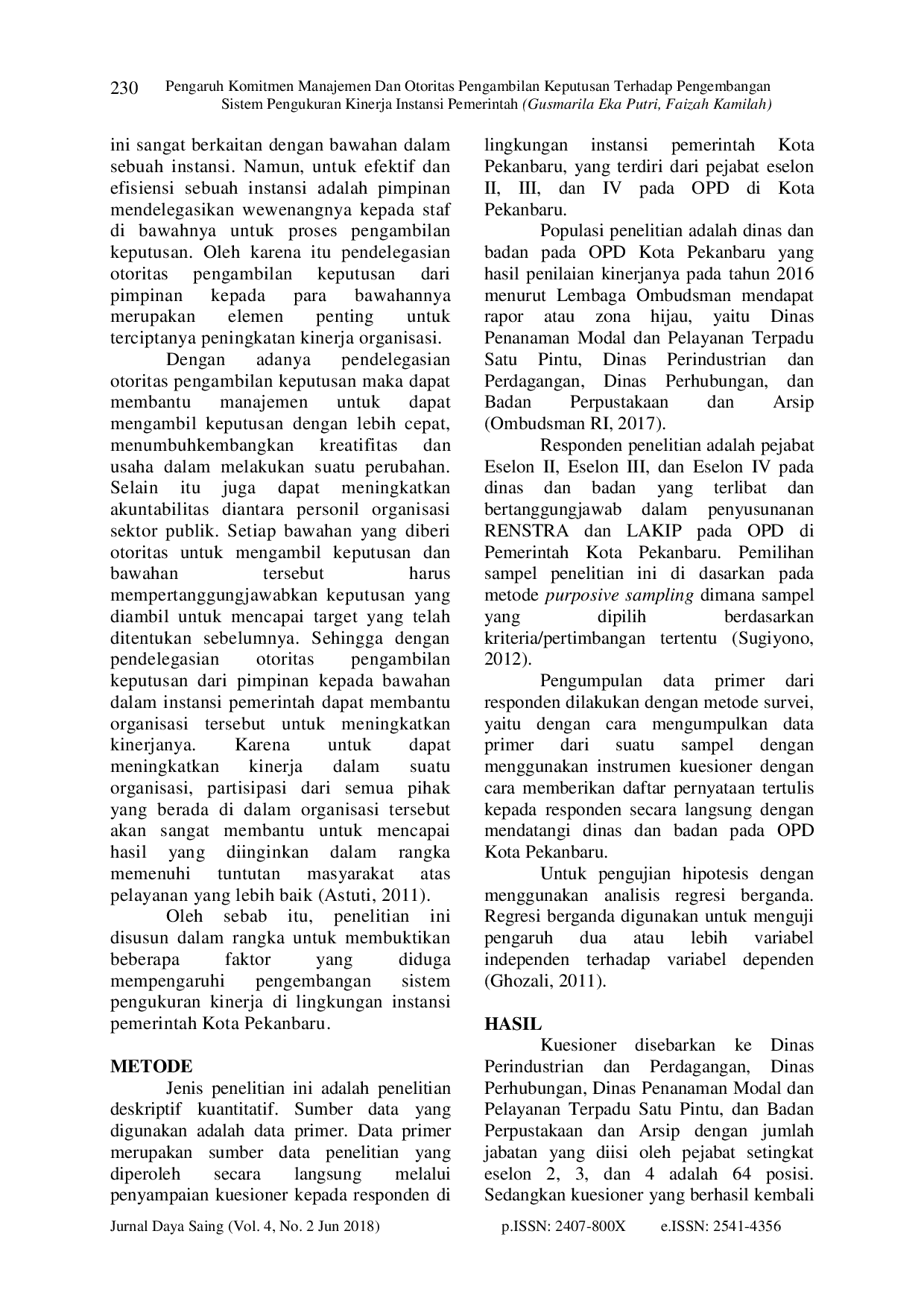 Jurnal Daya SaingJurnal Daya SaingMeningkatnya kesadaran masyarakat terhadap penyelenggaraan pemerintahan memicu gejolak yang berasal dari ketidakpuasan terhadap pertanggungjawaban yang diberikan oleh penyelenggara negara atas kepercayaan yang telah diamanatkan rakyat. Akibatnya, kinerja instansi pemerintah kini mendapat sorotan lebih karena masyarakat mulai mempertanyakan manfaat yang dapat diperoleh atas pelayanan yang diberikan. Oleh karena itu, hal ini mendorong peningkatan kebutuhan terhadap pengukuran kinerja penyelenggaraan negara. Pengukuran kinerja merupakan proses penilaian kemajuan pekerjaan terhadap tujuan dan sasaran yang telah ditentukan, termasuk informasi tentang efisiensi penggunaan sumberdaya, kualitas barang dan jasa, serta kegiatan yang diinginkan. Melalui pengukuran kinerja, keberhasilan satuan organisasi/kerja akan lebih dinilai dari kemampuannya mencapai hasil sesuai rencana strategis. Penelitian ini bertujuan membuktikan faktor-faktor yang diduga mempengaruhi pengembangan sistem pengukuran kinerja, dengan populasi OPD Pekanbaru yang meraih peringkat zona hijau dari Ombudsman periode 2016. Pengumpulan data dilakukan melalui penyebaran kuesioner kepada pejabat eselon 2, 3, dan 4, serta analisis data menggunakan regresi berganda.