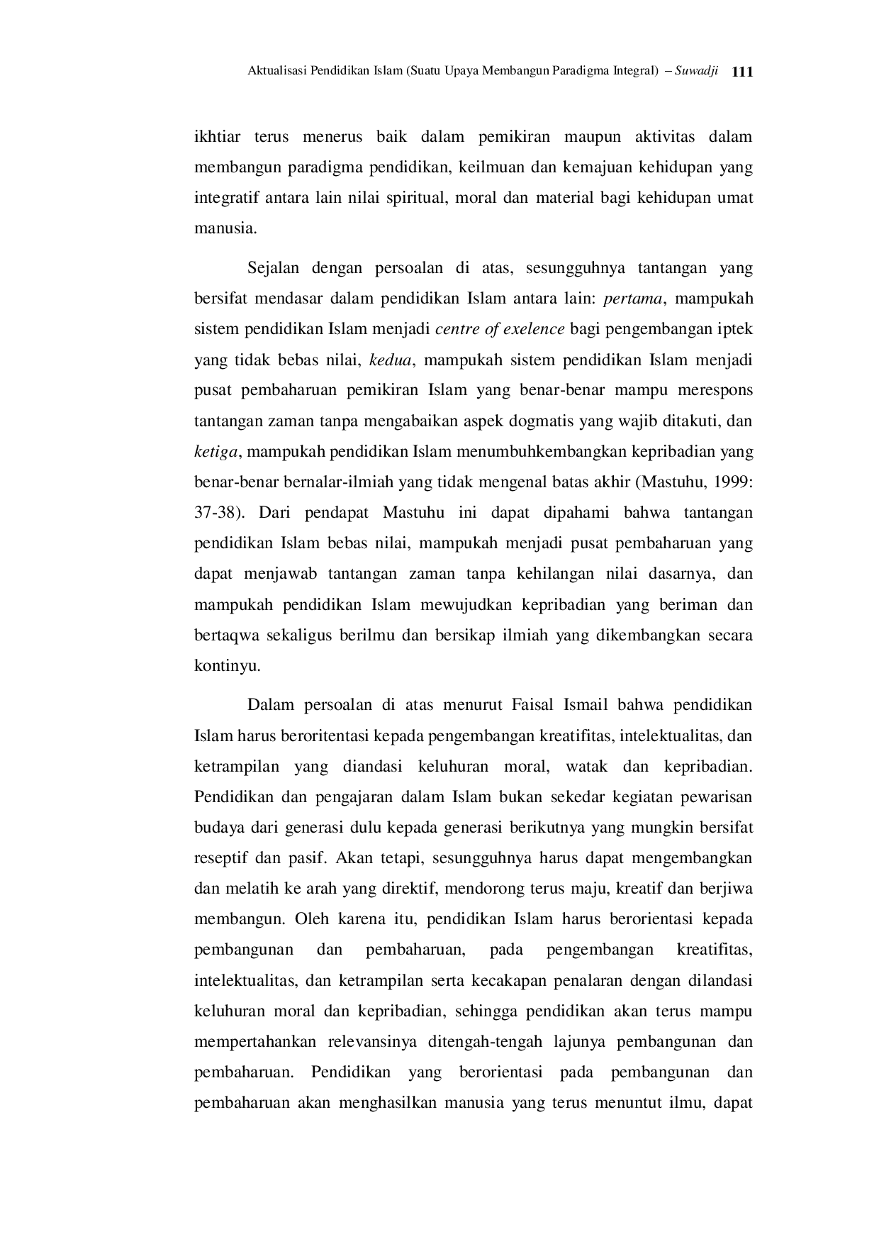 Berdasarkan gagasan mendasar tentang paradigma integral dalam pendidikan Islam, penelitian lanjutan dapat mengarah pada pengembangan implementasi yang lebih praktis dan terukur. Sebagai contoh, sebuah studi bisa menyelidiki secara mendalam bagaimana cara menerjemahkan konsep filosofis ini menjadi kurikulum operasional untuk jenjang pendidikan dasar atau menengah, yang secara eksplisit mengintegrasikan nilai-nilai spiritual, intelektual, dan keterampilan dalam setiap mata pelajaran. Selanjutnya, penelitian lain dapat mengidentifikasi dan menguji model pembelajaran mana yang paling efektif di kelas untuk menerapkan paradigma ini, agar proses pendidikan tidak hanya mentransfer ilmu tetapi juga membentuk karakter dan spiritualitas siswa secara seimbang. Terakhir, sebuah arah penelitian yang krusial adalah merancang instrumen evaluasi yang komprehensif, dengan menentukan indikator khusus untuk mengukur keberhasilan pembentukan manusia utuh insan kamil, yang melampaui ukuran keberhasilan sekadar nilai akademis semata. Dengan demikian, ide-ide ini mengembangkan konsep dari level wacana menjadi aplikasi nyata yang dapat diuji keefektifannya di lapangan, menjawab tantangan kurangnya model konkret yang diakui dalam makalah tersebut.
