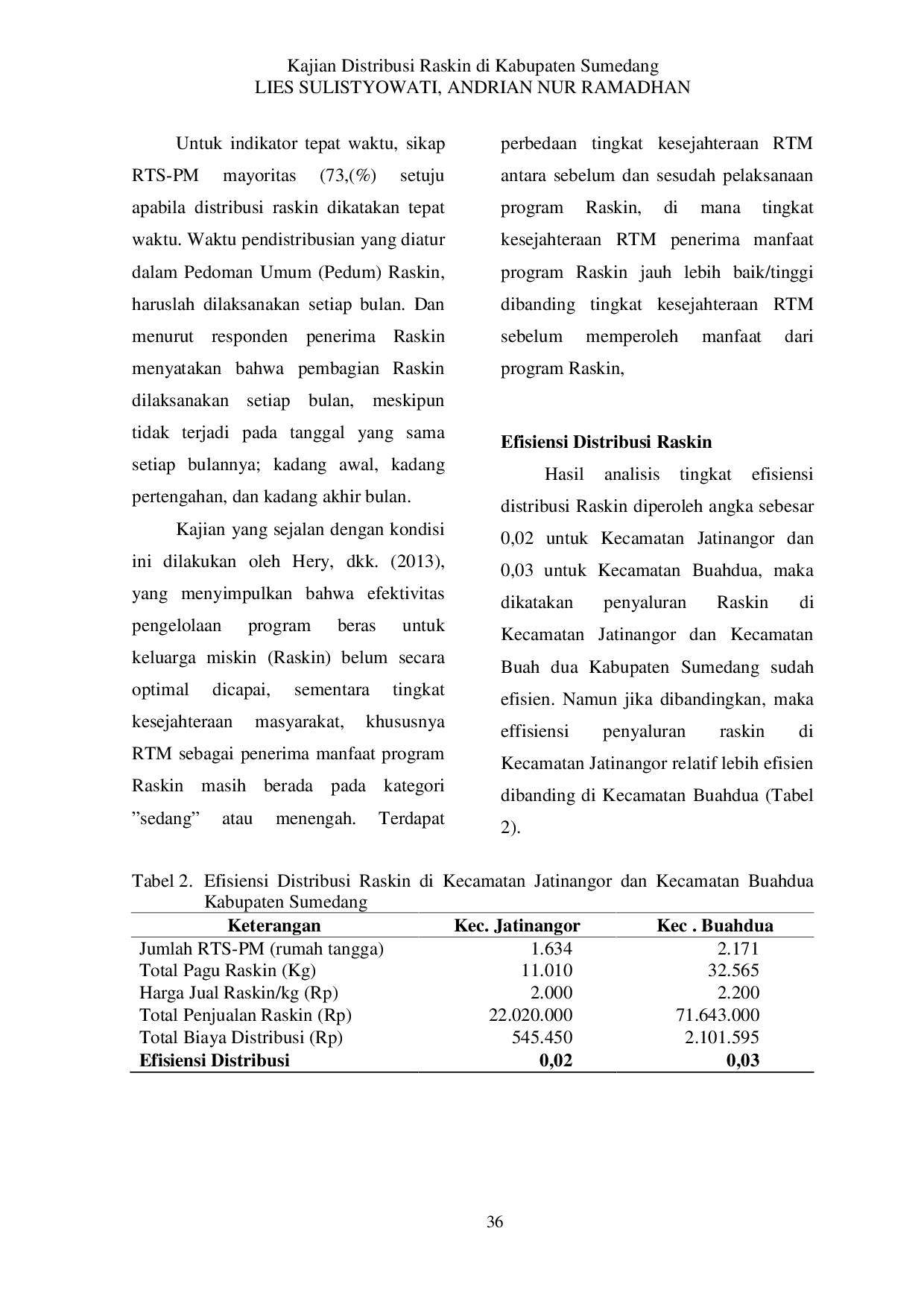 Mimbar Agribisnis : Jurnal Pemikiran Masyarakat Ilmiah Berwawasan AgribisnisMimbar Agribisnis : Jurnal Pemikiran Masyarakat Ilmiah Berwawasan AgribisnisRaskin merupakan salah satu program pemerintah Indonesia yang telah dilaksanakan sejak tahun 2002, yang ditujukan untuk mengurangi beban pengeluaran rumah tangga miskin sebagai bentuk dukungan untuk meningkatkan ketahanan pangan masyarakat. Namun dalam pelaksanaannya sering target lima tepat tidak tercapai atau kurang efektif dan efisien. Kajian ini bertujuan untuk menganalisis efektivitas dan efisiensi distribusi Raskin hingga sampai ke rumah tangga sasaran penerima manfaat (RTS-PM) Program Raskin di Jatinangor dan Kecamatan Buahdua.
