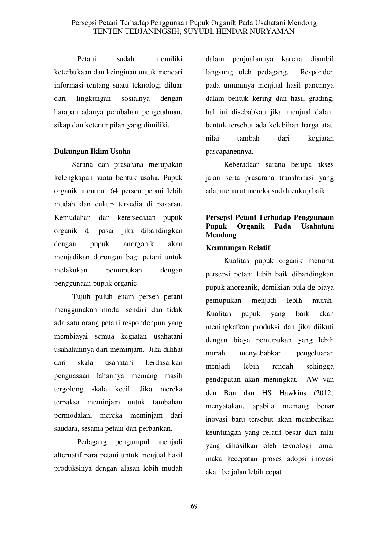 Karakteristik internal petani dan dukungan iklim usaha tergolong sedang, sementara persepsi petani terhadap inovasi pupuk organik juga berada pada kategori sedang, meskipun perilaku komunikasinya rendah.Secara simultan terdapat hubungan yang sangat erat antara karakteristik petani, perilaku komunikasi, dan dukungan usaha dengan persepsi penggunaan pupuk organik, di mana secara parsial perilaku komunikasi dan dukungan iklim usaha berpengaruh signifikan.Oleh karena itu, pembinaan secara individu dan kelembagaan masih sangat diperlukan untuk mendorong adopsi pupuk organik pada usahatani mendong.