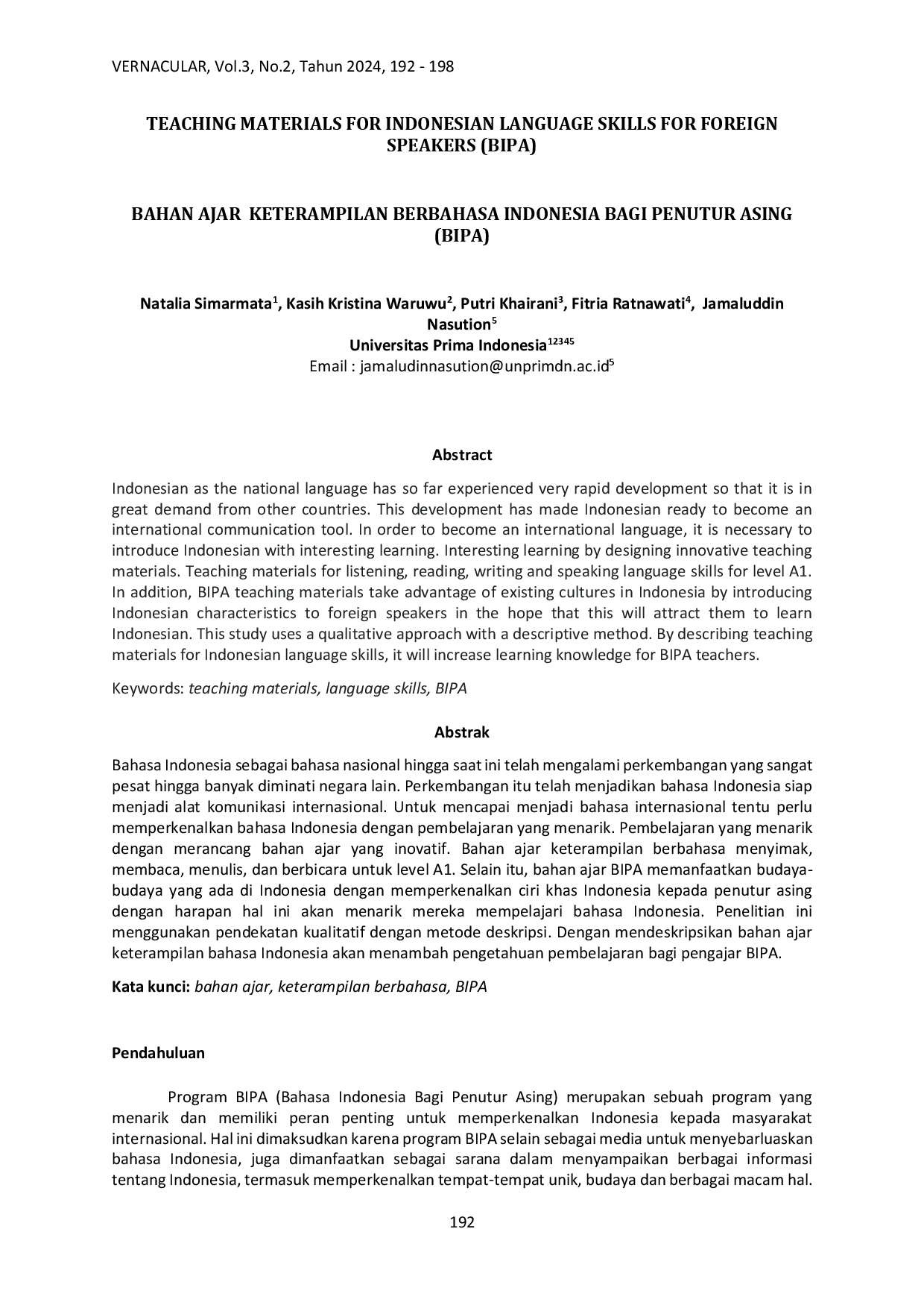 Vernacular: Linguistics, Literature, Communication and Culture JournalVernacular: Linguistics, Literature, Communication and Culture JournalBahasa Indonesia sebagai bahasa nasional hingga saat ini telah mengalami perkembangan yang sangat pesat hingga banyak diminati negara lain. Perkembangan itu telah menjadikan bahasa Indonesia siap menjadi alat komunikasi internasional. Untuk mencapai menjadi bahasa internasional tentu perlu memperkenalkan bahasa Indonesia dengan pembelajaran yang menarik. Pembelajaran yang menarik dengan merancang bahan ajar yang inovatif. Bahan ajar keterampilan berbahasa menyimak, membaca, menulis, dan berbicara untuk level A1. Selain itu, bahan ajar BIPA memanfaatkan budaya-budaya yang ada di Indonesia dengan memperkenalkan ciri khas Indonesia kepada penutur asing dengan harapan hal ini akan menarik mereka mempelajari bahasa Indonesia. Penelitian ini menggunakan pendekatan kualitatif dengan metode deskripsi. Dengan mendeskripsikan bahan ajar keterampilan bahasa Indonesia akan menambah pengetahuan pembelajaran bagi pengajar BIPA.