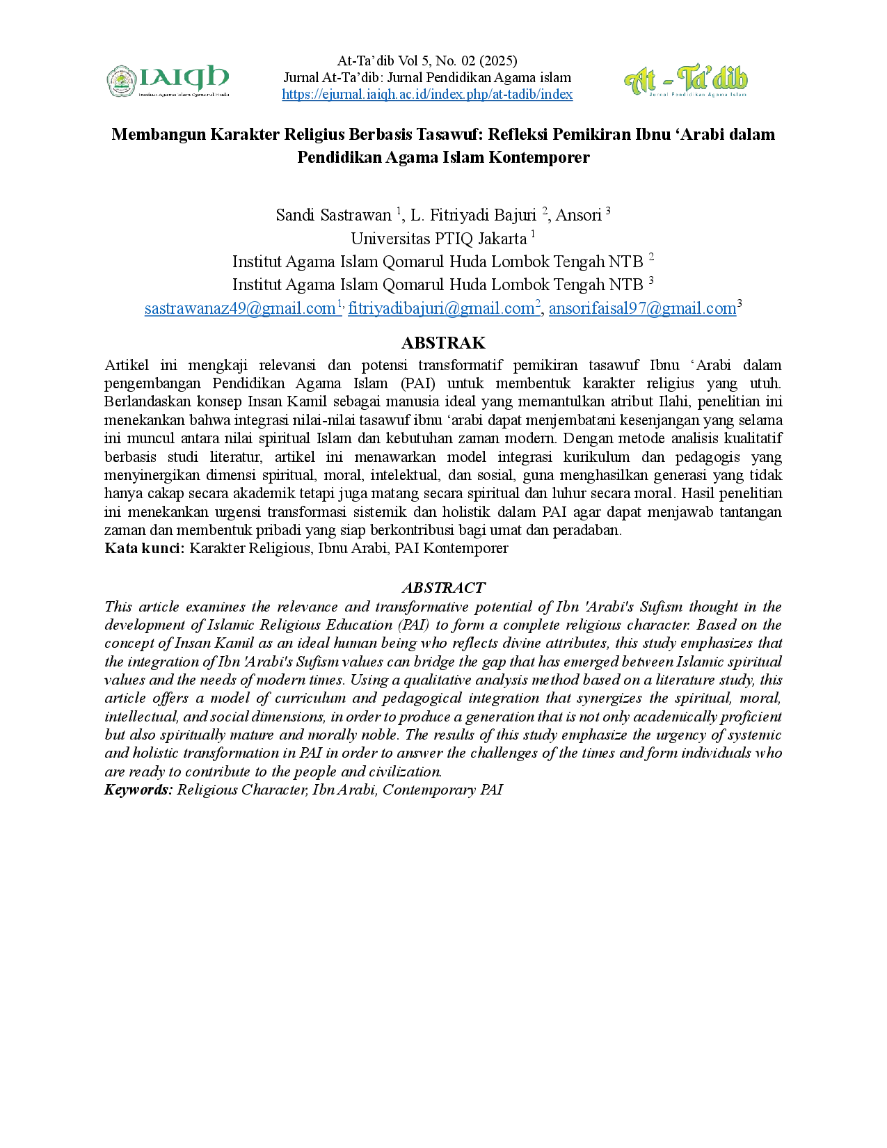 At-Ta'dib: Jurnal Pendidikan Agama IslamAt-Ta'dib: Jurnal Pendidikan Agama IslamArtikel ini mengkaji relevansi dan potensi transformatif pemikiran tasawuf Ibnu Arabi dalam pengembangan Pendidikan Agama Islam (PAI) untuk membentuk karakter religius yang utuh. Berlandaskan konsep Insan Kamil sebagai manusia ideal yang memantulkan atribut Ilahi, penelitian ini menekankan bahwa integrasi nilai-nilai tasawuf ibnu arabi dapat menjembatani kesenjangan yang selama ini muncul antara nilai spiritual Islam dan kebutuhan zaman modern. Dengan metode analisis kualitatif berbasis studi literatur, artikel ini menawarkan model integrasi kurikulum dan pedagogis yang menyinergikan dimensi spiritual, moral, intelektual, dan sosial, guna menghasilkan generasi yang tidak hanya cakap secara akademik tetapi juga matang secara spiritual dan luhur secara moral. Hasil penelitian ini menekankan urgensi transformasi sistemik dan holistik dalam PAI agar dapat menjawab tantangan zaman dan membentuk pribadi yang siap berkontribusi bagi umat dan peradaban.