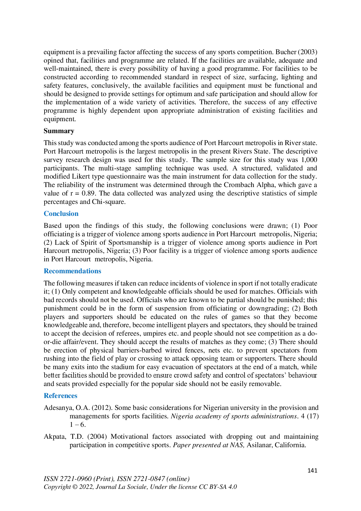 Journal La SocialeJournal La SocialePenelitian ini mengkaji apakah officiating yang buruk, kurangnya semangat sportmanship, dan fasilitas yang tidak memadai menjadi pemicu kekerasan di kalangan penonton olahraga di Metropolis Port Harcourt, Nigeria. Studi dilakukan terhadap penduduk Metropolis Port Harcourt, Negara Bagian Rivers dengan desain survei deskriptif dan melibatkan 1.000 responden. Teknik pengambilan sampel multi‑tahap serta kuesioner berbentuk Likert yang terstruktur, tervalidasi, dan dimodifikasi digunakan; reliabilitas instrumen diuji dengan Cronbach Alpha (r = 0,89). Analisis data menggunakan statistik chi‑square menunjukkan bahwa officiating yang buruk, kurangnya semangat sportmanship, dan fasilitas yang tidak memadai secara signifikan memicu perilaku kekerasan penonton; oleh karena itu disarankan penggunaan ofisial yang kompeten, edukasi pemain dan pendukung mengenai aturan permainan, serta penanaman sikap menerima keputusan wasit.