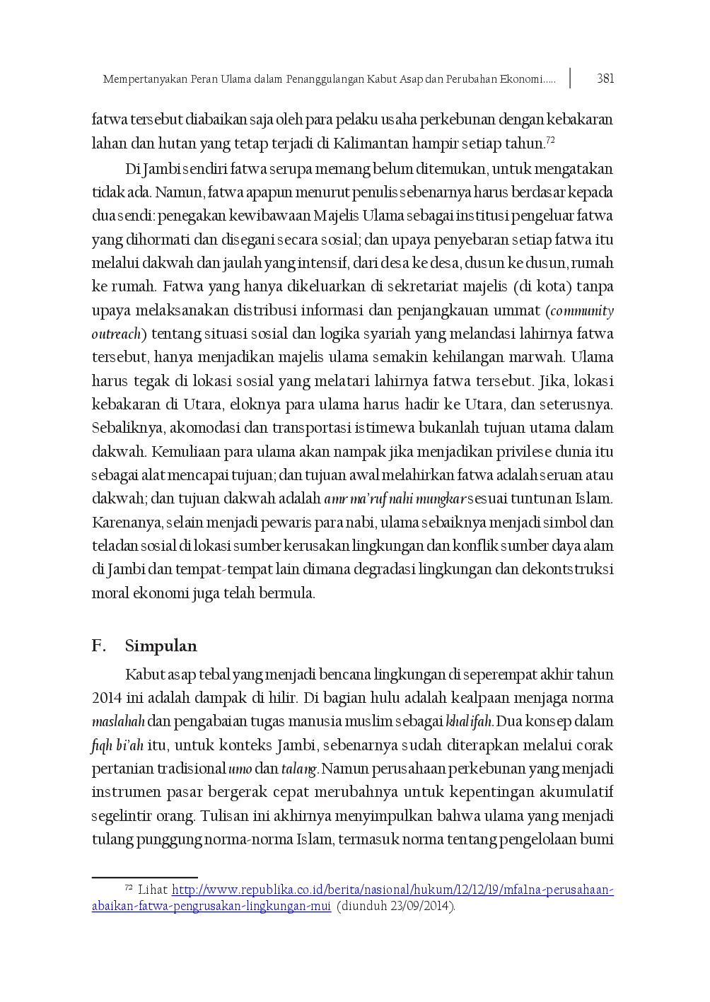 Industri perkebunan kelapa sawit yang berorientasi pada penggantian bahan bakar fosil semakin dinamis di Jambi, mendorong masyarakat agraris beralih ke pertanian komoditas kelapa sawit.Kabut asap yang terjadi hampir setiap tahun merupakan dampak dari perluasan perkebunan tersebut.Melalui tinjauan pustaka dan penelitian empiris dengan teknik wawancara dan observasi, studi ini mengungkap bahwa kabut asap dan transisi ekonomi tradisional adalah akibat dari kehadiran masif industri perkebunan kelapa sawit berbasis biofuel.Tulisan ini menyarankan strategi untuk mengatasi dua isu sosial dan ekonomi tersebut dengan memperkuat peran ulama dalam menyebarkan konsep al-maslahah dan khalifah terkait isu lingkungan dan sosial di Jambi, serta menegakkan identitas ulama sebagai penjaga nilai-nilai kebaikan (amr maruf nahi munkar) dalam kehidupan umat.Kabut asap di Jambi merupakan dampak hilir dari pengabaian prinsip al-maslahah dan tugas manusia sebagai khalifah dalam pengelolaan lingkungan, yang sebelumnya dijaga oleh sistem pertanian tradisional umo dan talang.Penelitian lanjutan bisa menggali bagaimana konsep al-maslahah dan khalifah dalam ajaran Islam bisa dijadikan dasar untuk merancang program pendidikan lingkungan berbasis pesantren di Jambi, yang melibatkan ulama, guru agama, dan masyarakat adat dalam menyusun kurikulum lokal tentang pengelolaan sumber daya alam secara berkelanjutan.Selain itu, perlu diteliti bagaimana narasi keagamaan yang disampaikan ulama di desa-desa sekitar perkebunan kelapa sawit memengaruhi sikap masyarakat terhadap pembakaran lahan, apakah justru memperkuat penerimaan atau menumbuhkan resistensi terhadap praktik destruktif tersebut.Terakhir, sebuah studi komparatif bisa dilakukan antara daerah yang memiliki kekuatan ulama kuat seperti Jambi dengan daerah lain yang mengalami kabut asap serupa, untuk mengidentifikasi faktor-faktor sosial dan keagamaan yang membuat fatwa lingkungan lebih efektif dalam mengubah perilaku masyarakat, bukan hanya sebagai dokumen hukum yang terpajang di kantor majelis ulama.Ulama sebagai penjaga norma Islam harus berdiri di garis depan melawan keliaran modal, dengan menegakkan ketauladanan, kesederhanaan, dan dakwah intensif untuk memulihkan kesadaran akan tanggung jawab etis terhadap lingkungan dan keadilan sosial.MEMPERTANYAKAN PERAN ULAMA DALAM PENANGGULANGAN KABUT ASAP DAN PERUBAHAN EKONOMI TRADISI MASYARAKAT JAMBI AKIBAT INDUSTRI BIOFUEL.Industri perkebunan kelapa sawit yang berorientasi pada penggantian bahan bakar fosil semakin dinamis di Jambi, mendorong masyarakat agraris beralih ke pertanian komoditas kelapa sawit.Kabut asap yang terjadi hampir setiap tahun merupakan dampak dari perluasan perkebunan tersebut.Melalui tinjauan pustaka dan penelitian empiris dengan teknik wawancara dan observasi, studi ini mengungkap bahwa kabut asap dan transisi ekonomi tradisional adalah akibat dari kehadiran masif industri perkebunan kelapa sawit berbasis biofuel.Tulisan ini menyarankan strategi untuk mengatasi dua isu sosial dan ekonomi tersebut dengan memperkuat peran ulama dalam menyebarkan konsep al-maslahah dan khalifah terkait isu lingkungan dan sosial di Jambi, serta menegakkan identitas ulama sebagai penjaga nilai-nilai kebaikan (amr maruf nahi munkar) dalam kehidupan umat.