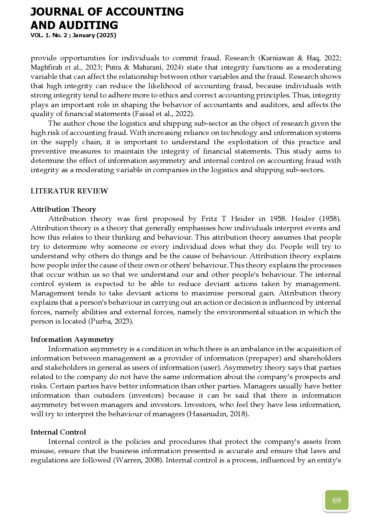 Journal of Accounting and AuditingJournal of Accounting and AuditingPenelitian ini bertujuan untuk menguji pengaruh asimetri informasi dan pengendalian internal terhadap kecurangan akuntansi, dengan integritas sebagai variabel moderasi, di sektor logistik Indonesia. Penelitian ini menggunakan pendekatan kuantitatif dengan data yang dikumpulkan melalui kuesioner dari 150 karyawan PT Indocitra Logistics Express (Access Logistics) yang disebar melalui media sosial. Setiap kuesioner berisi 51 pernyataan yang harus dijawab oleh responden. Analisis data dilakukan menggunakan metode Partial Least Square Structural Equation Modeling (PLS-SEM) versi 3.0. Hasil menunjukkan bahwa asimetri informasi memiliki pengaruh positif dan signifikan terhadap kecurangan akuntansi. Sebaliknya, pengendalian internal memiliki pengaruh positif tetapi tidak signifikan. Selain itu, integritas dapat memperkuat hubungan antara asimetri informasi dan kecurangan akuntansi, tetapi tidak memperkuat hubungan antara pengendalian internal dan kecurangan akuntansi.