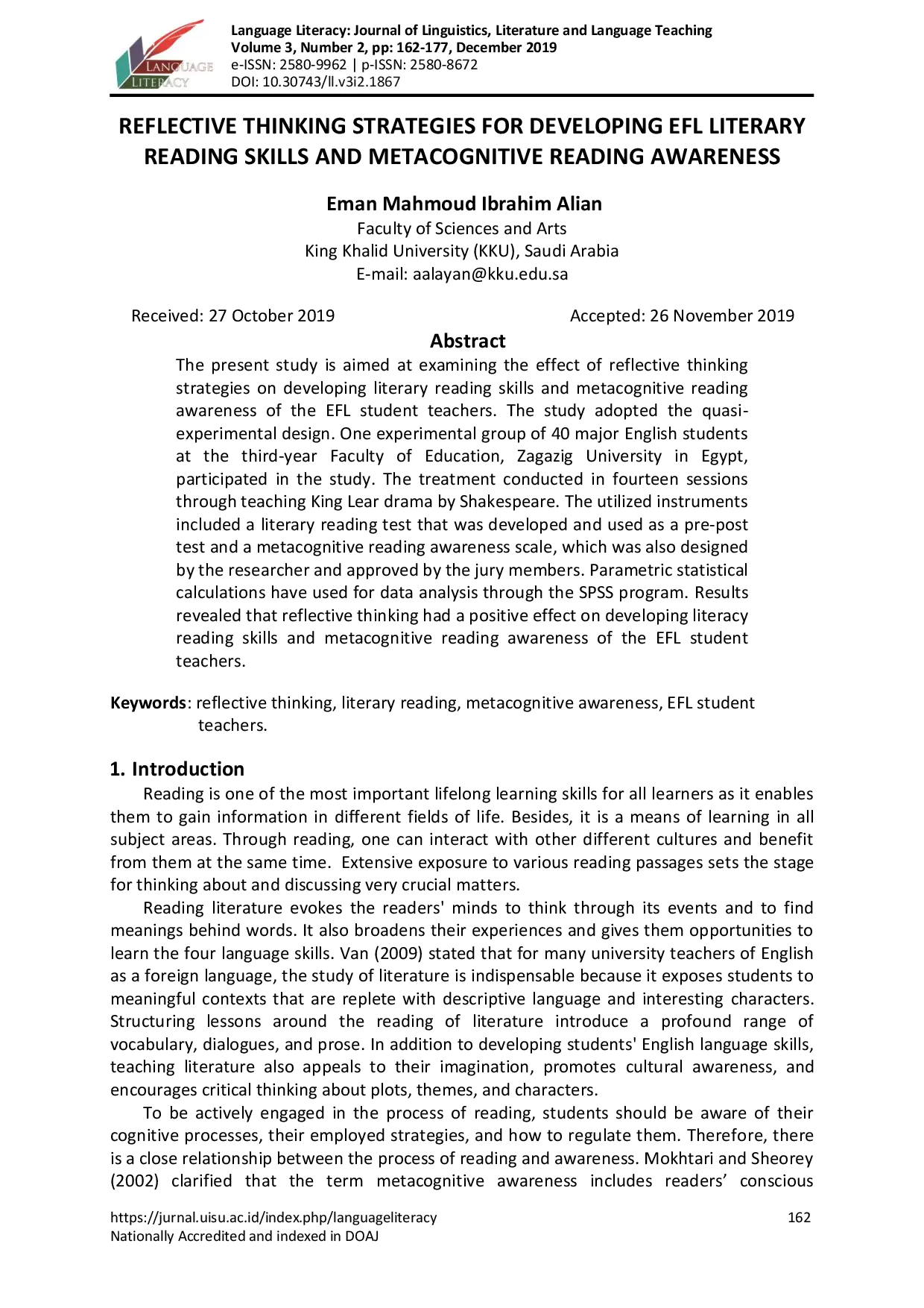 Language Literacy: Journal of Linguistics, Literature, and Language TeachingLanguage Literacy: Journal of Linguistics, Literature, and Language TeachingPenelitian ini bertujuan untuk menguji efek strategi berpikir reflektif dalam mengembangkan keterampilan membaca sastra dan kesadaran metakognitif membaca pada mahasiswa calon guru EFL. Penelitian menggunakan desain kuasi-eksperimental dengan satu kelompok eksperimen yang terdiri dari 40 mahasiswa jurusan Pendidikan Bahasa Inggris tahun ketiga di Universitas Zagazig, Mesir. Perlakuan dilakukan dalam empat belas sesi melalui pengajaran drama King Lear karya Shakespeare. Instrumen yang digunakan meliputi tes membaca sastra dan skala kesadaran metakognitif membaca. Analisis data menggunakan perhitungan statistik parametrik melalui program SPSS. Hasil penelitian menunjukkan bahwa berpikir reflektif memiliki efek positif dalam mengembangkan keterampilan membaca sastra dan kesadaran metakognitif membaca pada mahasiswa calon guru EFL.