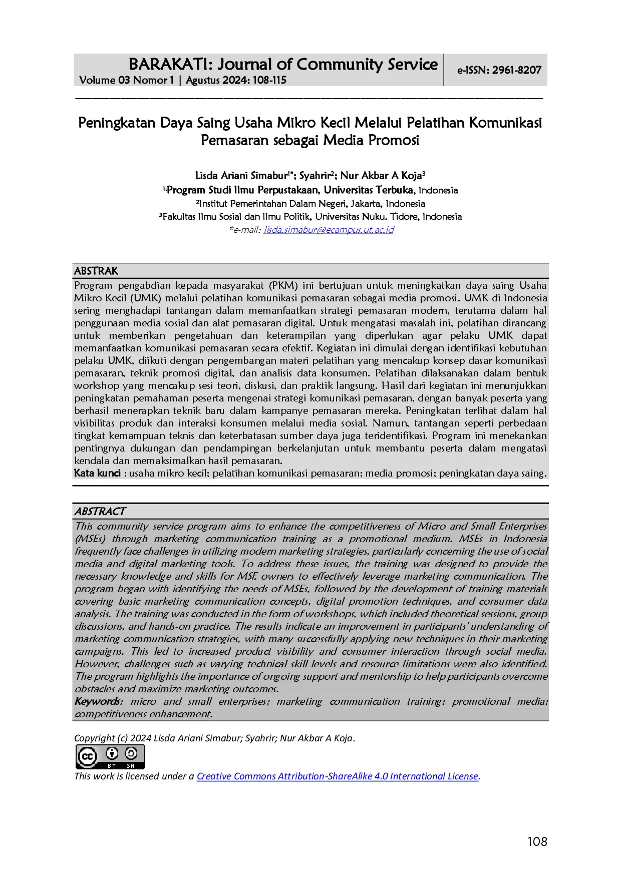 BARAKTI: Journal of Community ServiceBARAKTI: Journal of Community ServiceProgram pengabdian kepada masyarakat (PKM) ini bertujuan untuk meningkatkan daya saing Usaha Mikro Kecil (UMK) melalui pelatihan komunikasi pemasaran sebagai media promosi. UMK di Indonesia sering menghadapi tantangan dalam memanfaatkan strategi pemasaran modern, terutama dalam hal penggunaan media sosial dan alat pemasaran digital. Untuk mengatasi masalah ini, pelatihan dirancang untuk memberikan pengetahuan dan keterampilan yang diperlukan agar pelaku UMK dapat memanfaatkan komunikasi pemasaran secara efektif. Kegiatan ini dimulai dengan identifikasi kebutuhan pelaku UMK, diikuti dengan pengembangan materi pelatihan yang mencakup konsep dasar komunikasi pemasaran, teknik promosi digital, dan analisis data konsumen. Pelatihan dilaksanakan dalam bentuk workshop yang mencakup sesi teori, diskusi, dan praktik langsung. Hasil dari kegiatan ini menunjukkan peningkatan pemahaman peserta mengenai strategi komunikasi pemasaran, dengan banyak peserta yang berhasil menerapkan teknik baru dalam kampanye pemasaran mereka. Peningkatan terlihat dalam hal visibilitas produk dan interaksi konsumen melalui media sosial. Namun, tantangan seperti perbedaan tingkat kemampuan teknis dan keterbatasan sumber daya juga teridentifikasi. Program ini menekankan pentingnya dukungan dan pendampingan berkelanjutan untuk membantu peserta dalam mengatasi kendala dan memaksimalkan hasil pemasaran.