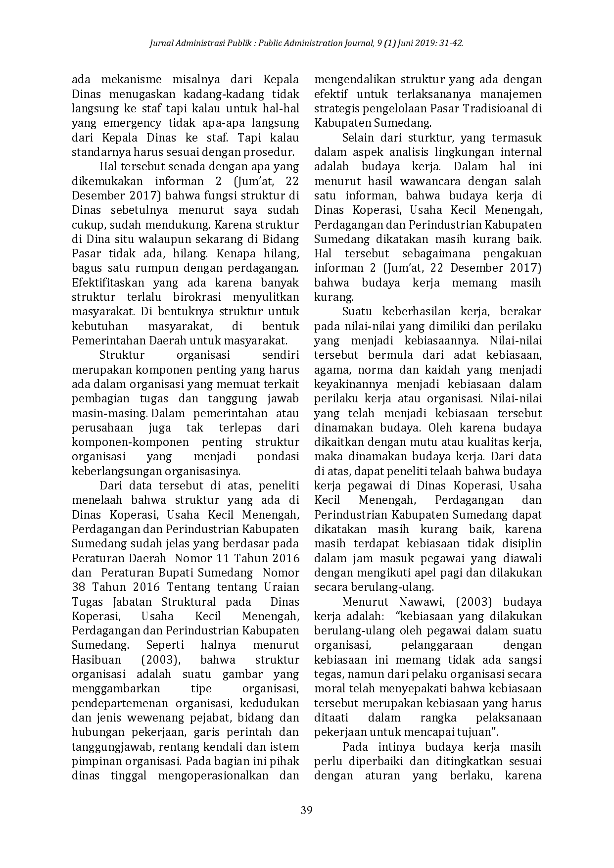 Jurnal Administrasi PublikJurnal Administrasi PublikPenelitian ini mengenai pengamatan lingkungan dalam mengelola Pasar Tradisional di Kabupaten Sumedang. Permasalahan yang menyangkut analisis eksternal yang ditandai dengan kurang representatifnya sarana dan prasarana dan terbatasnya tempat penyimpanan dokumen kerja, sedangkan pada analisis internal ditandai dengan pemberian tugas kepada pegawai yang tidak didasarkan dari kompetensi yang dimiliki tiap pegawai. Teori yang digunakan merujuk pada tahapan dalam manajemen strategis yang mengacu pada salah satu elemen dari empat elemen dasar dari manajemen strategis yaitu pengamatan lingkungan. Metode dalam penelitian ini menggunakan pendekatan kualitatif. Hasil penelitian menunjukan bahwa pada aspek analisis eksternal yang dilakukan oleh Dinas Koperasi, Usaha Kecil Menengah, Perdagangan dan Perindustrian Kabupaten Sumedang ini, belum sepenuhnya dapat menganalisis keadaan eksternal yaitu lingkungan kerja dan lingkungan sosial yang ada di Dinas Koperasi, Usaha Kecil Menengah, Perdagangan dan Perindustrian Kabupaten Sumedang untuk dijadikan suatu kekuatan atau daya dukung dalam pelaksanaan manajemen strategis pengelolaan Pasar Tradisional di Kabupaten Sumedang, ditandai dengan sarana dan prasarana penunjang lingkungan kerja yang masih terbatas dan lingkungan sosial yang masih menyisakan permasalahan sosial dari lemahnya penanganan sampah serta penempatan para Pedagang Kaki Lima. Sedangkan analisis internal pada aspek budaya harus diperbaiki dalam hal kedisiplinan kerja pegawai dan kompetensi sumber daya manusia harus ditingkatkan disesuaikan dengan kebutuhan penyelesaian kerja. Kata Kunci: Pengamatan Lingkungan, Analisis Eksternal, Analisis Internal, Pengelolaan Pasar Tradisional.