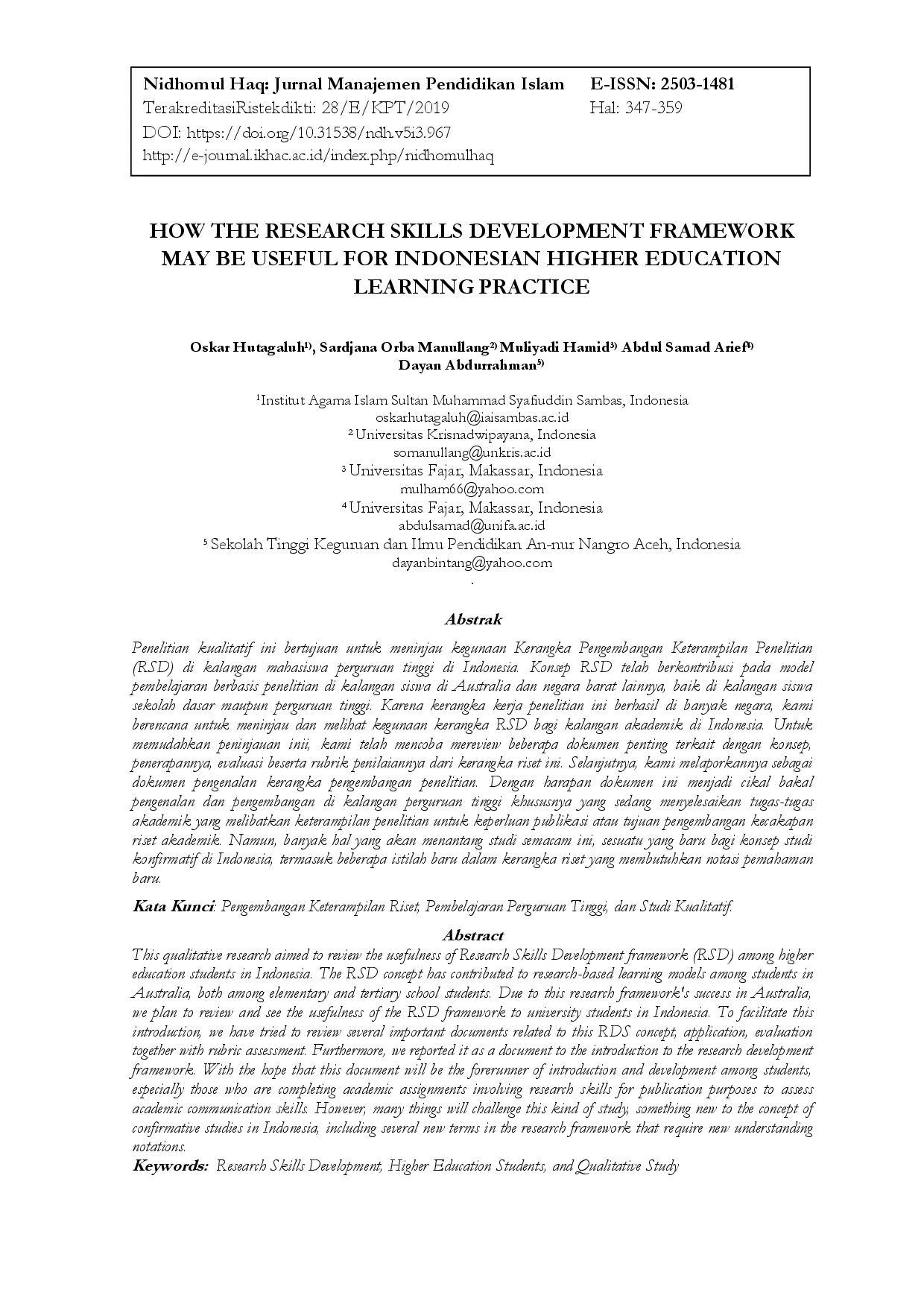 Nidhomul Haq : Jurnal Manajemen Pendidikan IslamNidhomul Haq : Jurnal Manajemen Pendidikan IslamPenelitian kualitatif ini bertujuan untuk meninjau kegunaan Kerangka Pengembangan Keterampilan Penelitian (RSD) di kalangan mahasiswa perguruan tinggi di Indonesia. Konsep RSD telah berkontribusi pada model pembelajaran berbasis penelitian di kalangan siswa di Australia dan negara barat lainnya, baik di kalangan siswa sekolah dasar maupun perguruan tinggi. Karena kerangka kerja penelitian ini berhasil di banyak negara, kami berencana untuk meninjau dan melihat kegunaan kerangka RSD bagi kalangan akademik di Indonesia. Untuk memudahkan peninjauan inii, kami telah mencoba mereview beberapa dokumen penting terkait dengan konsep, penerapannya, evaluasi beserta rubrik penilaiannya dari kerangka riset ini. Selanjutnya, kami melaporkannya sebagai dokumen pengenalan kerangka pengembangan penelitian. Dengan harapan dokumen ini menjadi cikal bakal pengenalan dan pengembangan di kalangan perguruan tinggi khususnya yang sedang menyelesaikan tugas-tugas akademik yang melibatkan keterampilan penelitian untuk keperluan publikasi atau tujuan pengembangan kecakapan riset akademik. Namun, banyak hal yang akan menantang studi semacam ini, sesuatu yang baru bagi konsep studi konfirmatif di Indonesia, termasuk beberapa istilah baru dalam kerangka riset yang membutuhkan notasi pemahaman baru.