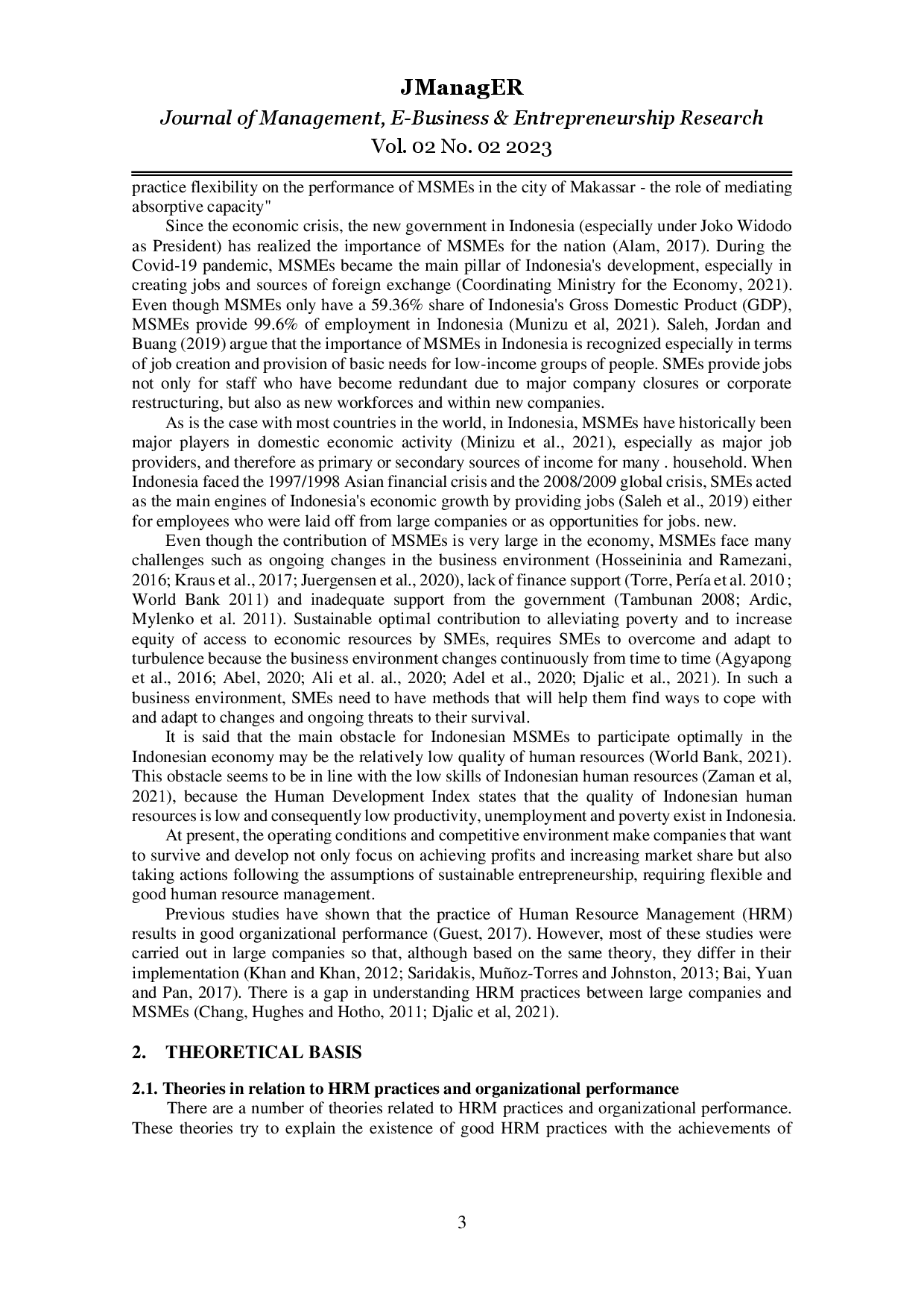 JManagERJManagERStudi ini dimaksudkan untuk mengeksplorasi pengaruh praktik HRM terhadap kinerja organisasi SMEs di Kota Metropolitan Makassar. Praktik HRM untuk bisnis kecil diklaim kurang diterapkan dibandingkan bisnis besar. Dengan survei untuk mengumpulkan data, 36 pemilik atau manajer usaha kecil dan menengah berpartisipasi dalam studi ini. Data yang dikumpulkan dianalisis secara deskriptif, lalu analisis faktor diterapkan untuk memadatkan variabel yang diamati sebelum analisis regresi. Hasil menunjukkan bahwa intensitas praktik HRM masih tertinggal. Namun, praktik HRM memiliki pengaruh positif yang signifikan terhadap kinerja organisasi. Disarankan bahwa praktik HRM terbaik harus terus diterapkan oleh pemilik atau manajer SMEs.