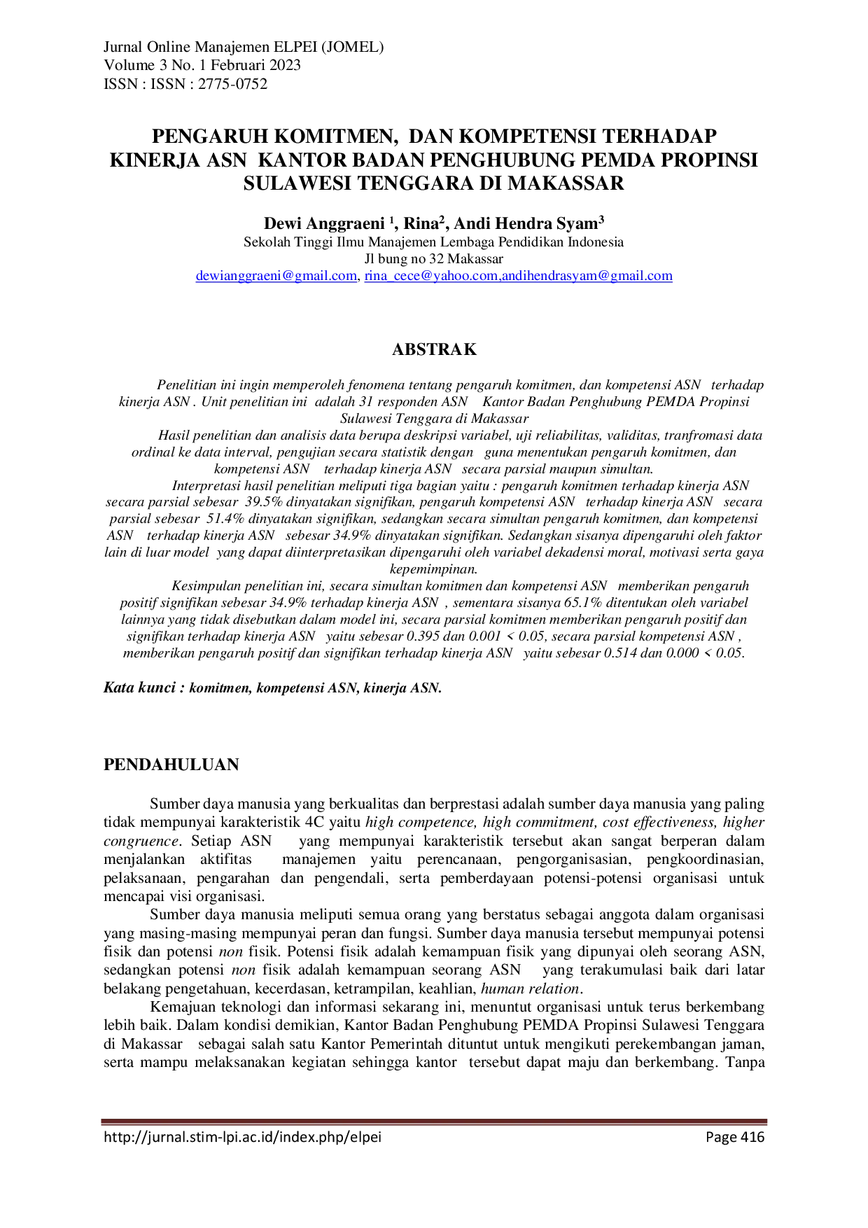 Jurnal Online Manajemen ELPEIJurnal Online Manajemen ELPEIPenelitian ini bertujuan untuk memahami pengaruh komitmen dan kompetensi ASN terhadap kinerja ASN. Unit analisis penelitian ini adalah 31 responden ASN di Kantor Badan Penghubung PEMDA Provinsi Sulawesi Tenggara di Makassar. Hasil penelitian menunjukkan bahwa komitmen secara parsial berpengaruh signifikan terhadap kinerja ASN sebesar 39,5%, kompetensi ASN secara parsial berpengaruh signifikan terhadap kinerja ASN sebesar 51,4%, dan secara simultan pengaruh komitmen dan kompetensi ASN terhadap kinerja ASN sebesar 34,9%. Sisanya dipengaruhi oleh faktor lain seperti dekadensi moral, motivasi, dan gaya kepemimpinan.