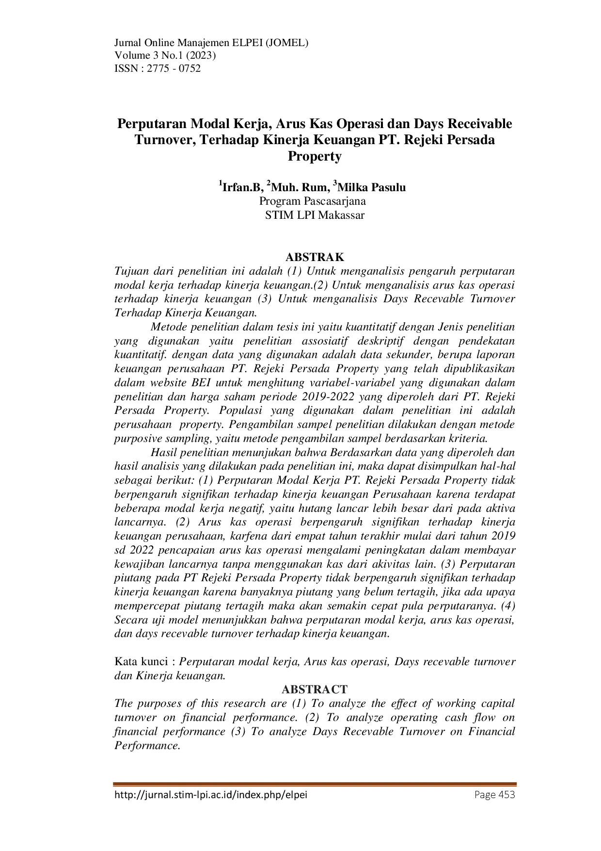 Jurnal Online Manajemen ELPEIJurnal Online Manajemen ELPEITujuan dari penelitian ini adalah (1) Untuk menganalisis pengaruh perputaran modal kerja terhadap kinerja keuangan, (2) Untuk menganalisis arus kas operasi terhadap kinerja keuangan, (3) Untuk menganalisis Days Recevable Turnover Terhadap Kinerja Keuangan. Metode penelitian dalam tesis ini adalah kuantitatif dengan jenis penelitian deskriptif asosiatif dengan pendekatan kuantitatif, menggunakan data sekunder laporan keuangan PT. Rejeki Persada Property yang dipublikasikan di website BEI dan harga saham periode 2019-2022. Pengambilan sampel dilakukan dengan metode *purposive sampling*. Hasil penelitian menunjukkan bahwa: (1) Perputaran Modal Kerja PT. Rejeki Persada Property tidak berpengaruh signifikan terhadap kinerja keuangan karena terdapat modal kerja negatif (hutang lancar lebih besar dari aktiva lancar). (2) Arus kas operasi berpengaruh signifikan terhadap kinerja keuangan karena peningkatan arus kas operasi dari tahun 2019 hingga 2022 dalam membayar kewajiban lancar. (3) Perputaran piutang pada PT Rejeki Persada Property tidak berpengaruh signifikan terhadap kinerja keuangan karena banyaknya piutang yang belum tertagih. Secara uji model menunjukkan bahwa perputaran modal kerja, arus kas operasi, dan days recevable turnover mempengaruhi kinerja keuangan.