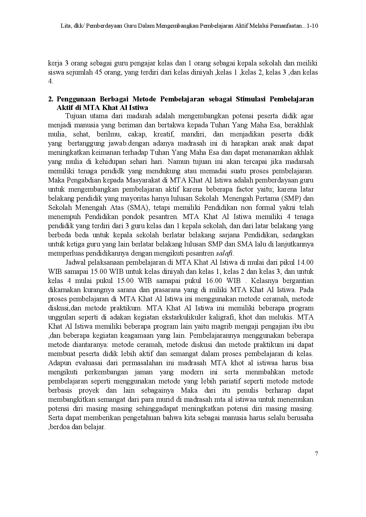 PEMTEKDIKMAS (PENGABDIAN EKONOMI MULTIDISIPLIN TEKNOLOGI PENDIDIKAN UNTUK MASYARAKAT)PEMTEKDIKMAS (PENGABDIAN EKONOMI MULTIDISIPLIN TEKNOLOGI PENDIDIKAN UNTUK MASYARAKAT)Pendidikan agama Islam merupakan salah satu aspek penting dalam pembentukan karakter dan akhlak siswa. Ada berbagai lembaga Pendidikan Islam yang salah satunya adalah madrasah. Kiprah madrasah dalam membangun karakter bangsa dengan penanaman nilai‑nilai agama sebagai bagian dalam penyelenggaraan pendidikan disamping pemberian ilmu pengetahuan perlu menjadi perhatian. Karena penyelenggaraan pendidikan madrasah telah mendorong pendidikan di Indonesia semakin besar, membantu pencapaian wajib belajar serta meningkatkan angka partisipasi sekolah. Sebagai bagian integral dalam Sistem Pendidikan Nasional (Sisdiknas), Madrasah Takmiliyah Awaliah Al Istiwa merupakan lembaga pendidikan agama Islam yang berlokasi di Kampung Babakan, RT/RW 02/01, Desa Pabuaran, Kecamatan Rangkasbitung, Kabupaten Lebak, yang telah berdiri sejak 2004 dan memiliki reputasi baik dalam meningkatkan kualitas pendidikan agama Islam. Pada proses pembelajaran di MTA Khat Al Istiwa, pemanfaatan sumber belajar cetak dan berbasis lingkungan diterapkan untuk mengembangkan pembelajaran aktif bagi siswa.