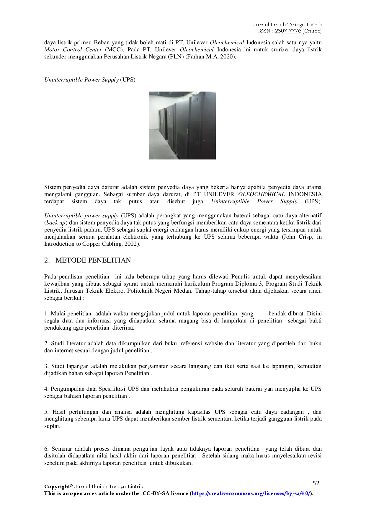 Jurnal Ilmiah Tenaga ListrikJurnal Ilmiah Tenaga ListrikListrik merupakan kebutuhan pokok manusia dimana semua aktifitas manusia selalu bergantung pada listrik.. Pada PT Unilever Oleochemical Indonesia memiliki dua sumber sebagai penyedia energi listrik yaitu Combine Heat and Power (CHP) sebagai penyedia energi listrik utama dan Perusahaan Listrik Negara (PLN) sebagai penyedia energi listrik back up saat CHP mengalami gangguan yang menyebabkan CHP harus shut down. Agar tidak terjadi hal yang tidak diinginkan yaitu terputusnya jaringan listrik dapat menyebabkan black out (padam total). Maka, digunakan Uninteruptible Power Supplay (UPS) sebagai pemasok energi listrik alternatif untuk mengantisipasi pemadaman listrik secara tiba‑tiba sembari menunggu diaktifkannya atau proses sinkronisasi dari CHP ke PLN. UPS adalah suatu sistem yang dapat mengubah tegangan AC menjadi DC lalu menjadi AC. perubahan melewati beberapa tahap, Pada tahap pertama, input suplai tegangan AC diubah menjadi DC oleh rectifier (saat tidak terjadi gangguan di sumber, pada rectifier terjadi proses charge untuk mengisi daya pada baterai) dan pada langkah selanjutnya inverter mengubah tegangan DC menjadi AC. Berdasarkan data parameter pada UPS DB 1, UPS mampu memberikan daya kepada beban selama 1,4 jam (maksimum). Beban UPS di plant soap and dove sebesar 63,65 % (terpakai 254,6 KVA dari 400 kVA), masih dapat dilakukan penambahan beban yang lebih lagi, Semakin besar kapasitas baterai dalam sebuah UPS maka UPS akan mampu mensuplai tenaga lebih lama dari pada UPS dengan kapasitas yang lebih kecil. Laporan ini fokus membahas lama UPS dapat nge back up beban critical pada plant soap and dove tanpa generator yang di lakukan dengan menggunakan metode observasi di lapangan.