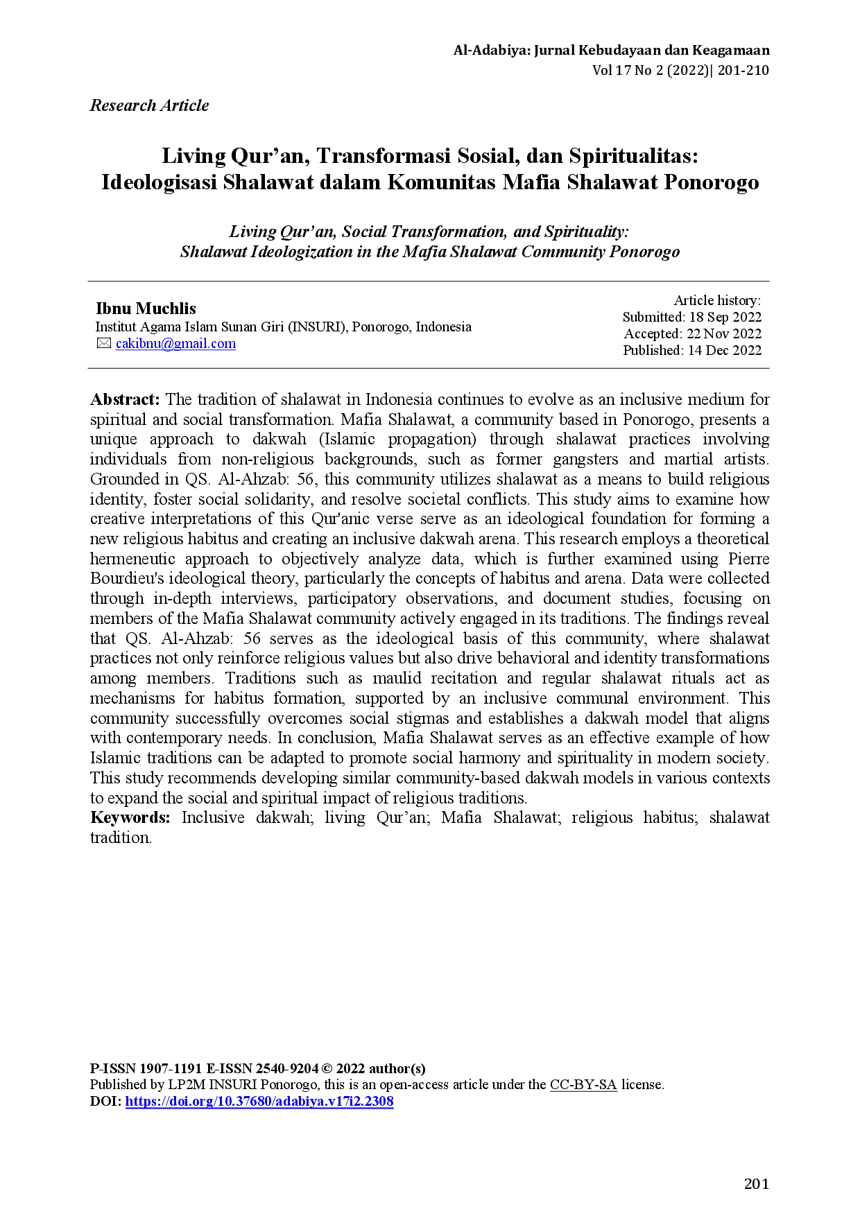 - Living Qur’an, Transformasi Sosial, dan Spiritualitas: Ideologisasi Shalawat dalam Komunitas Mafia... doi.org/10.37680/adabiya.v17i2.2308Living QurAoan Transformasi Sosial dan Spiritualitas Ideologisasi Shalawat dalam Komunitas Mafia doi 10 37680 adabiya v17i2 2308