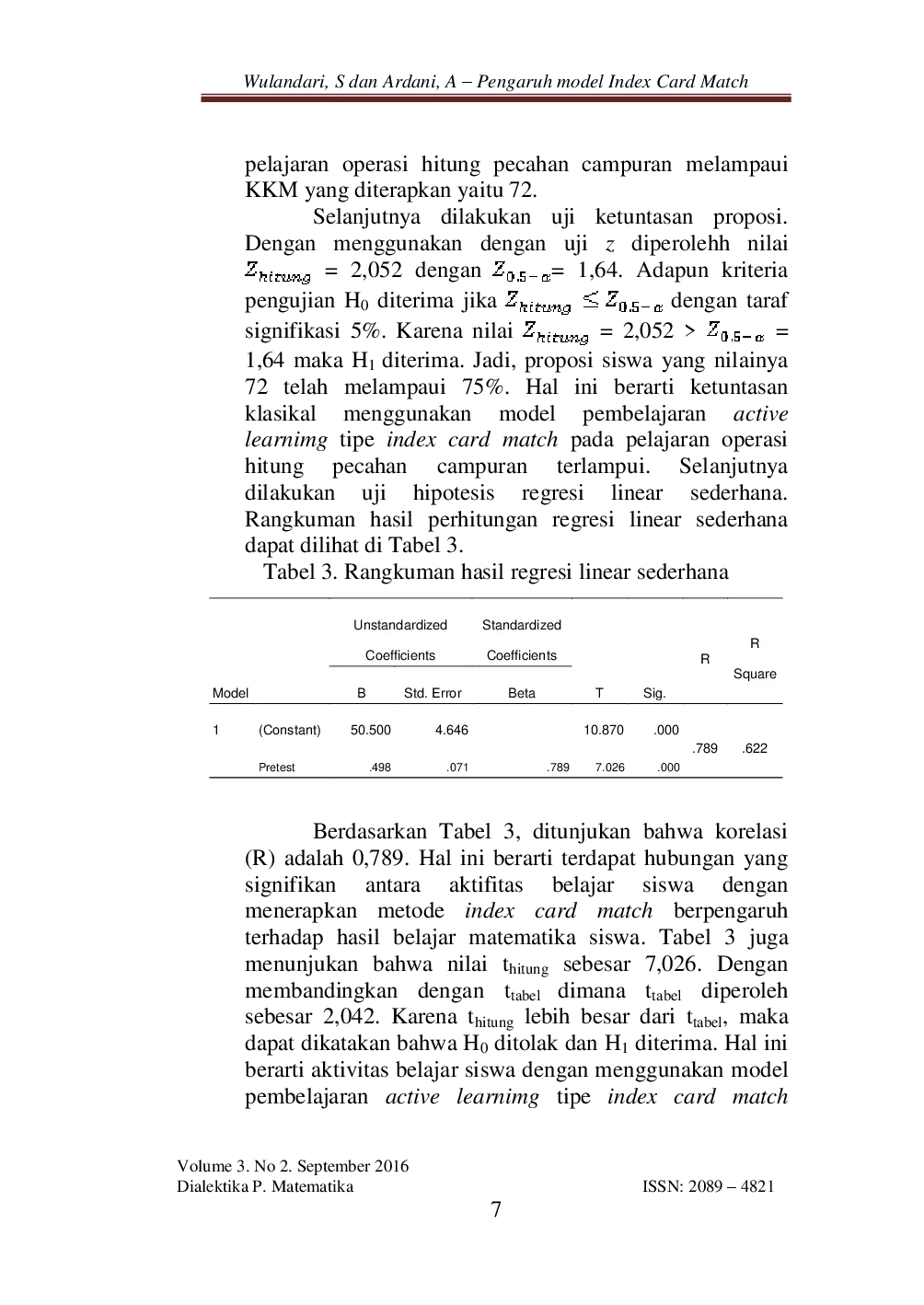 Berdasarkan analisis data serta pembahasan, maka dapat disimpulkan bahwa rerata hasil belajar matematika siswa pada materi operasi hitung pecahan campuran dengan menerapkan model active learning tipe index card match mencapai KKM secara Individual dan KKM secara klasikal, (2) terdapat pengaruh yang signifikan dari penerapan model active learning tipe index card match terhadap hasil belajar matematika siswa kelas VA pada materi operasi hitung pecahan campuran SD Negeri 01 Karangbawang Kecamatan Ajibarang Kabupaten Banyumas Tahun Pelajaran 2015/2016 sebesar 62,2%.Dilihat dari nilai Determinasi (R Square) = 0,622 yang memiliki arti bahwa besarnya pengaruh aktivitas siswa dengan menerapkan model active learning tipe index card match terhadap hasil belajar matematika siswa kelas VA pada materi operasi hitung pecahan campuran SD Negeri 01 Karangbawang Kecamatan Ajibarang Kabupaten Banyumas Tahun Pelajaran 2015/2016 sebesar 62,2%.Sisanya 37,8% dipengaruhi oleh variabel lain, yang tidak terdapat dalam penelitian ini.
