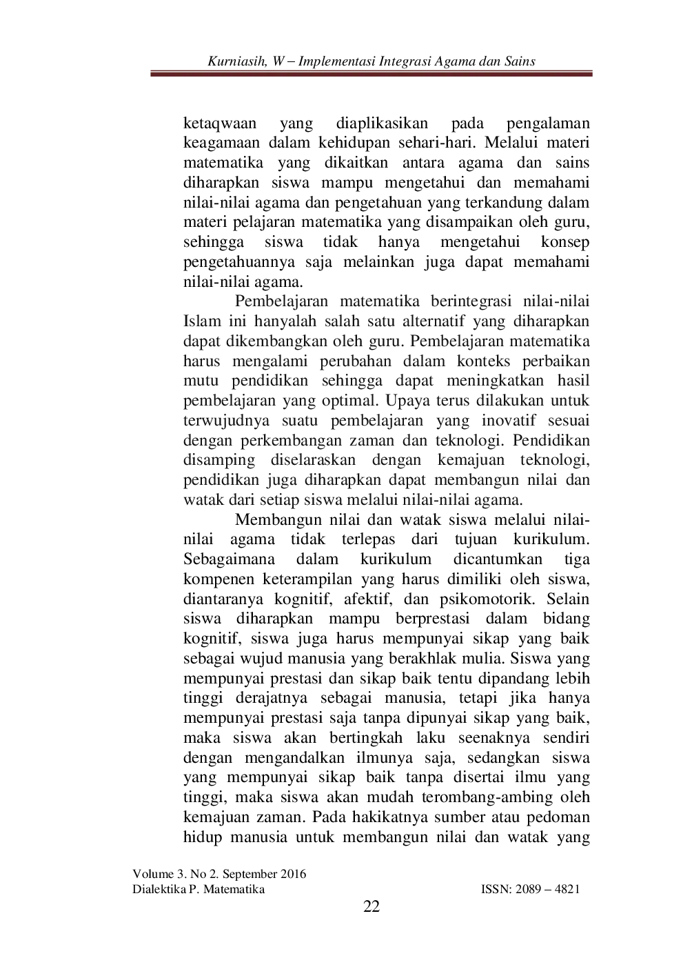 Jurnal Dialektika Program Studi Pendidikan MatematikaJurnal Dialektika Program Studi Pendidikan MatematikaAkhlak dan moral siswa yang semakin menurun merupakan salah satu permasalahan pendidikan di Indonesia yang harus segera diatasi. Tujuan penelitian ini adalah untuk mengetahui implementasi integrasi agama dan sains dalam pembelajaran sebagai alternative solusi untuk masalah tersebut. Penelitian ini merupakan penelitian kualitatif dengan pendekatan studi kasus. Hasil penelitian yang diperoleh pembelajaran berbasis integrasi agama dan sains yang dilakukan menggabungkan disiplin ilmu yang serumpun, khususnya memasukkan nilai-nilai agama disetiap pembelajaran yang bertujuan selain untuk mengetahui pemahaman tentang materi, siswa juga dapat mengetahui nilai-nilai Islam yang terkait dengan materi yang sedang dipelajari.