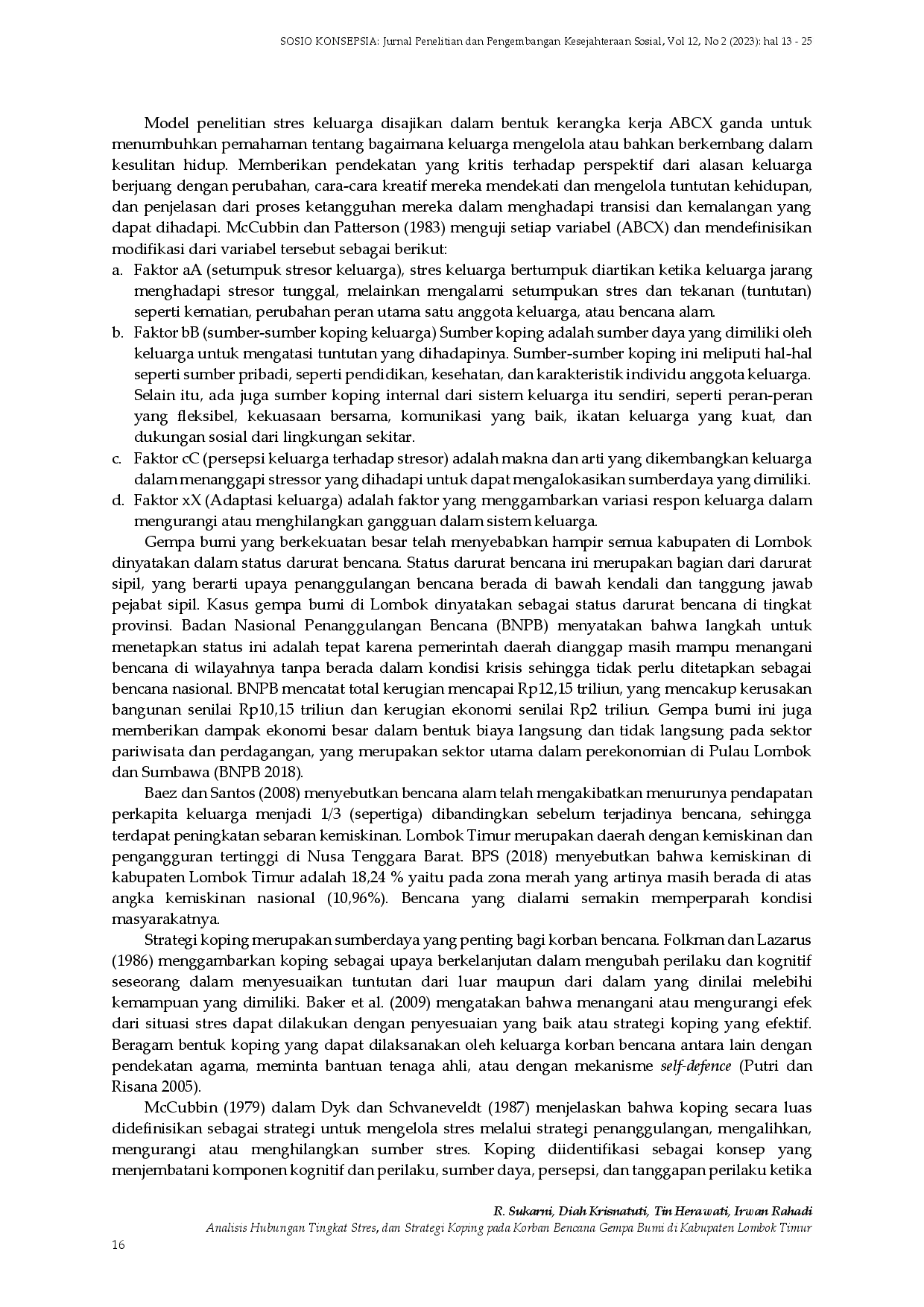Sosio Konsepsia: Jurnal Penelitian dan Pengembangan Kesejahteraan SosialSosio Konsepsia: Jurnal Penelitian dan Pengembangan Kesejahteraan SosialPenelitian ini dilakukan di dua kecamatan di kabupaten Lombok Timur, yaitu Sambelia dan Sembalun. Tujuan dari penelitian ini adalah untuk melakukan analisis hubungan antara tingkat stres dan strategi koping keluarga korban bencana. Hasil penelitian membuktikan bahwa tingkat stres responden di daerah pegunungan secara signifikan lebih tinggi daripada di wilayah pesisir. Penelitian ini merekomendasikan bahwa keluarga memiliki peran penting dalam mengurangi gejala stres. Keluarga dapat melakukan ini dengan melakukan interaksi positif dan komunikasi yang baik satu sama lain, sehingga menciptakan lingkungan yang saling menguatkan. Pemerintah juga diharapkan untuk memberikan pendampingan psikologi jangka panjang kepada keluarga korban bencana.
