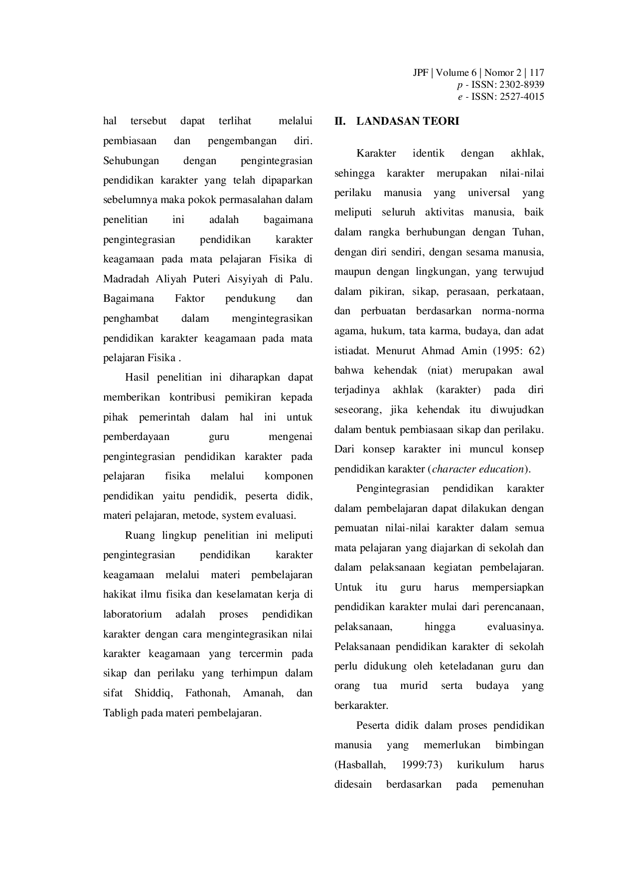 Jurnal Pendidikan FisikaJurnal Pendidikan FisikaPenelitian ini bertujuan untuk menggambarkan pengintegrasian pendidikan karakter keagamaan pada pembelajaran hakikat ilmu fisika dan keselamatan kerja di laboratorium, faktor pendukung dan penghambat di Madrasah Aliyah Puteri Aisyiah Palu. Hasil penelitian pengintegrasian pendidikan karakter keagamaan pada mata pelajaran fisika melalui pembelajaran hakikat ilmu fisika dan keselamatan kerja di laboratorium dengan melakukan intervensi atau menanamkan nilai-nilai karakter keagamaan shiddiq, amanah, tabligh dan fathanah, akidah, akhlak, ibadah dan berwawasan luas , pada materi fisika yang diajarkan. Metode Pembelajaran menggunakan pendekatan Proses Ilmiah dengan metode Diskusi untuk memahami hakikat ilmu fisika dan keselamatan kerja di laboratorium. didukung oleh manajemen madrasah berbasis pesantren yang semua peserta didik diasramakan yang berasal dari 10 kabupaten di Provinsi Sulawesi Tengah. Faktor penghambat didalam mengimplementasikan pendidikan karakter diantaranya masih terdapat guru mengajar yang tidak sesuai dengan kompetensi guru professional atau guru yang mengajar tidak sesuai dengan kualifikasi pendidikan yang sebenarnya.