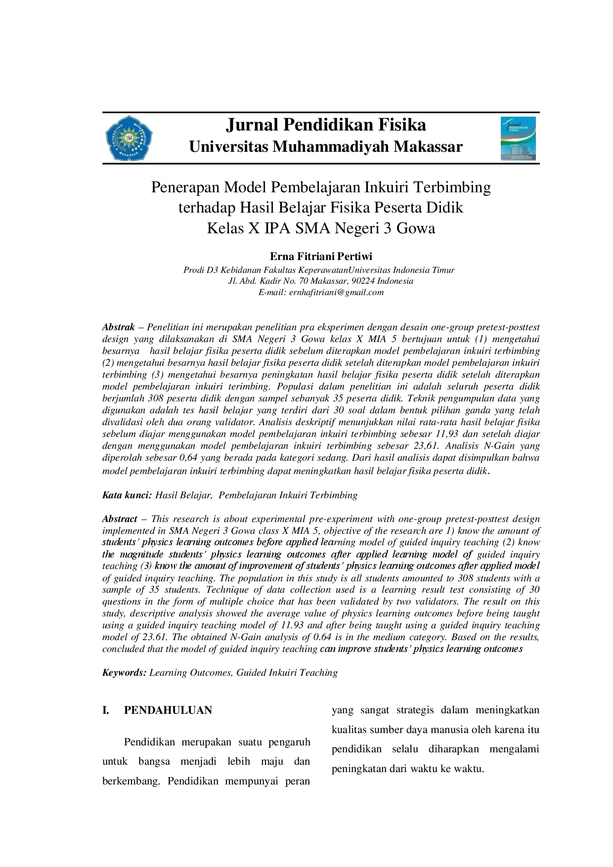 Jurnal Pendidikan FisikaJurnal Pendidikan FisikaPenelitian ini merupakan penelitian pra eksperimen dengan desain one-group pretest-posttest design yang dilaksanakan di SMA Negeri 3 Gowa kelas X MIA 5 bertujuan untuk (1) mengetahui besarnya hasil belajar fisika peserta didik sebelum diterapkan model pembelajaran inkuiri terbimbing (2) mengetahui besarnya hasil belajar fisika peserta didik setelah diterapkan model pembelajaran inkuiri terbimbing (3) mengetahui besarnya peningkatan hasil belajar fisika peserta didik setelah diterapkan model pembelajaran inkuiri terimbing. Populasi dalam penelitian ini adalah seluruh peserta didik berjumlah 308 peserta didik dengan sampel sebanyak 35 peserta didik. Teknik pengumpulan data yang digunakan adalah tes hasil belajar yang terdiri dari 30 soal dalam bentuk pilihan ganda yang telah divalidasi oleh dua orang validator. Analisis deskriptif menunjukkan nilai rata-rata hasil belajar fisika sebelum diajar menggunakan model pembelajaran inkuiri terbimbing sebesar 11,93 dan setelah diajar dengan menggunakan model pembelajaran inkuiri terbimbing sebesar 23,61. Analisis N-Gain yang diperolah sebesar 0,64 yang berada pada kategori sedang. Dari hasil analisis dapat disimpulkan bahwa model pembelajaran inkuiri terbimbing dapat meningkatkan hasil belajar fisika peserta didik.