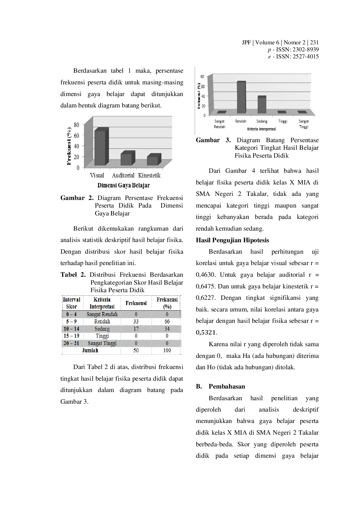 Jurnal Pendidikan FisikaJurnal Pendidikan FisikaPenelitian ini merupakan penelitian ex-post facto bersifat analisis korelasional dengan tujuan untuk mendeskripsikan tingkat gaya belajar visual, auditorial dan kinestetik dan hasil belajar fisika yang dicapai peserta didik kelas X MIA di SMA Negeri 2 Takalar serta hubungan antara kedua variabel tersebut. Populasi dalam penelitian ini adalah seluruh kelas X MIA SMA Negeri 2 Takalar, dengan sampel penentuan jumlah sampel penelitian berdasarkan teknik random sampling dan perhitungan sampel minimum menggunakan nomogram Harry King sebanyak 50 responden. Teknik analisis data yang digunakan adalah analisis statistik deskriptif dan analisis statistik inferensial yang meliputi uji normalitas, uji linearitas dan uji korelasi product moment. Dari hasil penelitian dapat disimpulkan bahwa tingkat gaya belajar peserta didik didominasi oleh gaya belajar visual, kemudian auditorial dan kinestetik, tingkat hasil belajar fisika peserta didik berada pada kategori rendah, dan terdapat hubungan positif yang signifikan antara gaya belajar dengan hasil belajar fisika peserta didik kelas X MIA di SMA Negeri 2 Takalar.