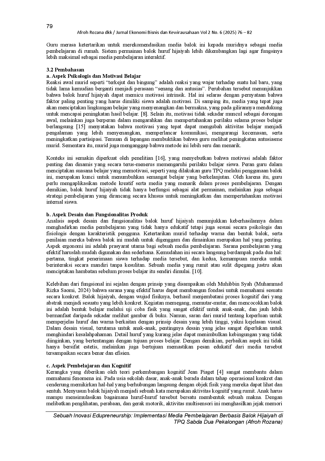 Jurnal Ekonomi Bisnis dan KewirausahaanJurnal Ekonomi Bisnis dan KewirausahaanPenelitian kualitatif dengan pendekatan studi kasus ini menyelidiki inovasi balok huruf hijaiyah sebagai sebuah produk edupreneurship di TPQ Sabda Dua Pekalongan. Tujuannya adalah untuk mengatasi masalah fundamental dalam pembelajaran bahasa Arab, yaitu rendahnya motivasi dan penguasaan huruf hijaiyah di kalangan siswa. Penelitian ini mengimplementasikan media pembelajaran langsung berbasis permainan tersebut dan menganalisis efektivitasnya melalui triangulasi data, termasuk observasi partisipan, wawancara mendalam dengan seorang pengajar dan 17 siswa, serta analisis dokumen. Temuan penelitian mengungkapkan bahwa pendekatan kinestetik dan visual melalui balok ini secara signifikan mampu menciptakan pengalaman belajar yang menyenangkan dan mengurangi kecemasan siswa. Keunikan media ini terletak pada kemampuannya mentransformasi pembelajaran pasif menjadi aktif dan partisipatif. Hasilnya, terlihat peningkatan yang nyata dalam hal antusiasme partisipasi di kelas, kecepatan dalam mengenali bentuk huruf, serta ketepatan dalam menyusun huruf menjadi suku kata. Dari perspektif edupreneurship, media ini tidak hanya efektif secara pedagogis tetapi juga menunjukkan potensi komersial yang dapat mendukung sustainability lembaga. Nilai ekonomi dari produk ini memperkuat posisinya sebagai terobosan dalam merintis model bisnis pendidikan yang berkelanjutan. Sebagai rekomendasi, pengembangan lanjutan diperlukan pada aspek estetika desain, variasi permainan, serta integrasi dengan teknologi digital untuk memperluas dampak dan daya tariknya.