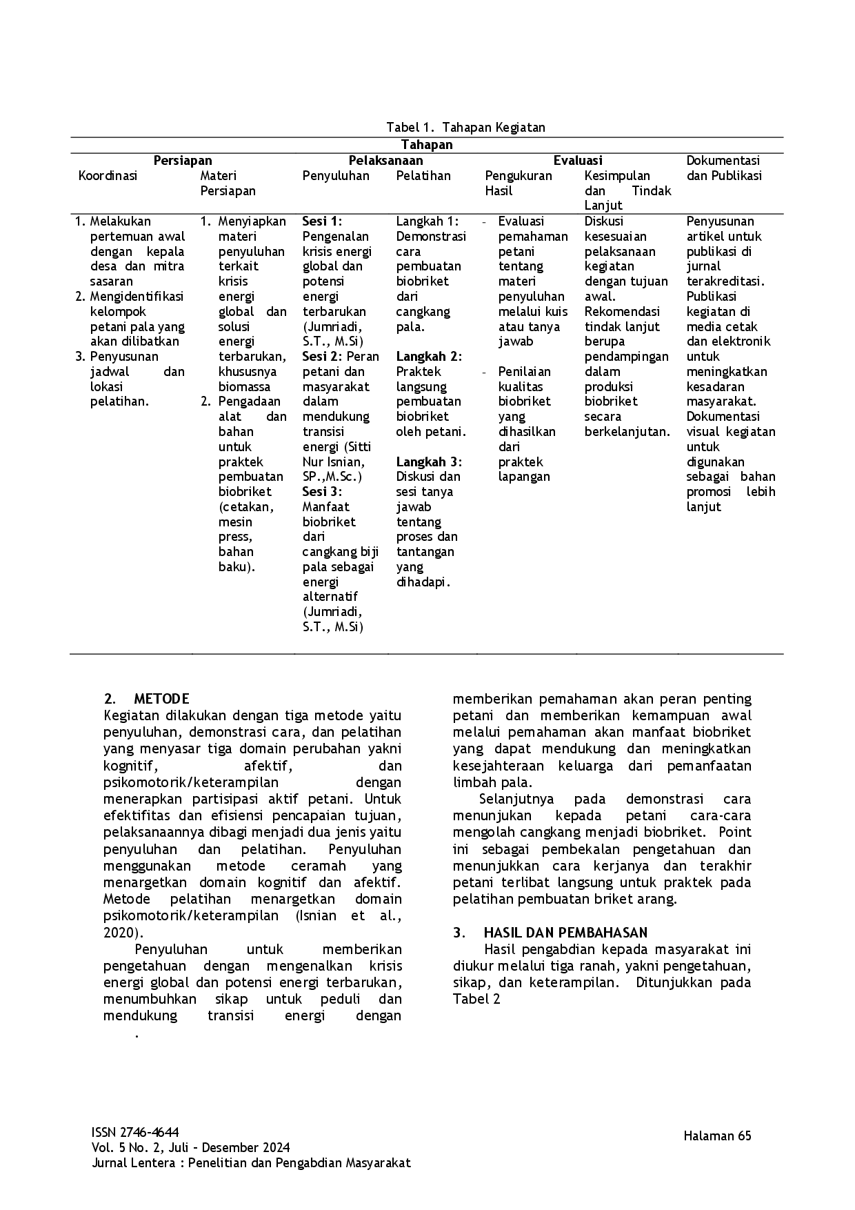 Jurnal Lentera: Penelitian dan Pengabdian MasyarakatJurnal Lentera: Penelitian dan Pengabdian MasyarakatKrisis energi yang ditandai dengan menipisnya sumber energi fosil mengharuskan semua pihak yang terlibat untuk mewaspadai kondisi ini. Pengabdian masyarakat ini bertujuan untuk mengedukasi dan memberikan kesadaran, pengetahuan, sikap dan keterampilan petani pala di Desa Kaasar, Kecamatan Kauditan, tentang pemanfaatan limbah pertanian pala sebagai energi alternatif yang ramah lingkungan (biobriket) dan dapat digunakan untuk meningkatkan pendapatan keluarga dalam meningkatkan mata pencaharian mereka.