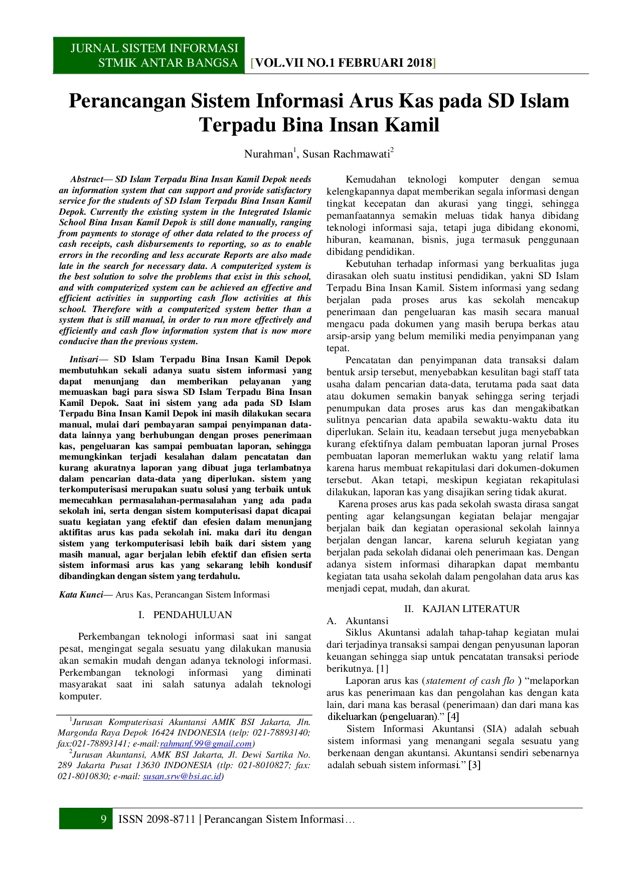 Jurnal Sistem InformasiJurnal Sistem InformasiSD Islam Terpadu Bina Insan Kamil Depok membutuhkan suatu sistem informasi yang dapat menunjang dan memberikan pelayanan yang memuaskan bagi para siswa. Saat ini sistem yang ada masih dilakukan secara manual, mulai dari pembayaran hingga penyimpanan data lain yang berhubungan dengan proses penerimaan kas, pengeluaran kas, hingga pembuatan laporan, sehingga memungkinkan terjadinya kesalahan dalam pencatatan dan kurang akuratnya laporan yang dibuat serta terlambatnya dalam pencarian data yang diperlukan. Sistem yang terkomputerisasi merupakan solusi terbaik untuk memecahkan permasalahan yang ada, serta dengan sistem komputerisasi dapat dicapai suatu kegiatan yang efektif dan efisien dalam menunjang aktivitas arus kas pada sekolah ini. Maka dari itu, sistem yang terkomputerisasi lebih baik dari sistem yang masih manual, agar berjalan lebih efektif dan efisien serta sistem informasi arus kas yang sekarang lebih kondusif dibandingkan dengan sistem yang terdahulu.