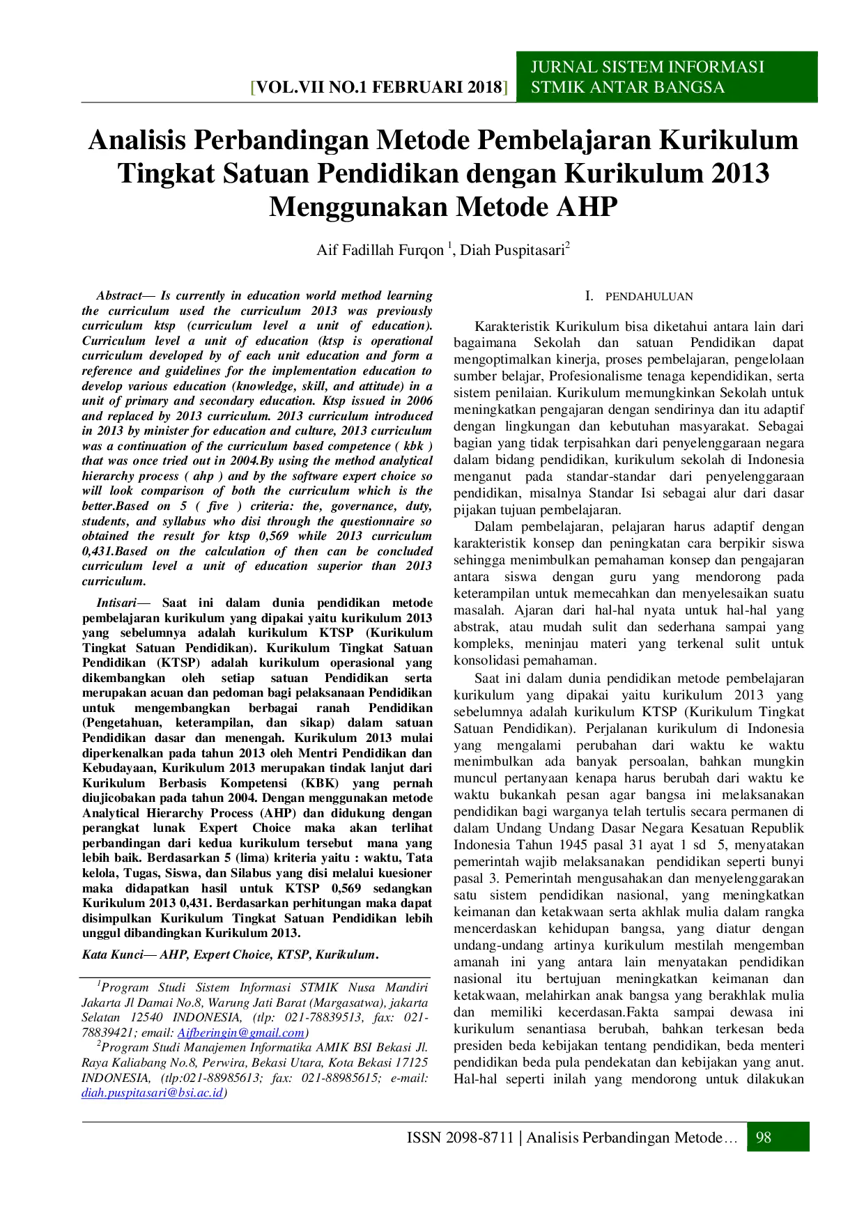 Jurnal Sistem InformasiJurnal Sistem InformasiSaat ini dalam dunia pendidikan metode pembelajaran kurikulum yang dipakai yaitu kurikulum 2013 yang sebelumnya adalah kurikulum KTSP (Kurikulum Tingkat Satuan Pendidikan). Kurikulum Tingkat Satuan Pendidikan (KTSP) adalah kurikulum operasional yang dikembangkan serta merupakan acuan dan pedoman bagi pelaksanaan Pendidikan untuk mengembangkan berbagai ranah Pendidikan (Pengetahuan, keterampilan, dan sikap) dalam satuan Pendidikan dasar dan menengah. Kurikulum 2013 mulai diperkenalkan pada tahun 2013 oleh Mentri Pendidikan dan Kebudayaan, Kurikulum 2013 merupakan tindak lanjut dari Kurikulum Berbasis Kompetensi (KBK) yang pernah diujicobakan pada tahun 2004. Dengan menggunakan metode Analytical Hierarchy Process (AHP) dan didukung dengan perangkat lunak Expert Choice maka akan terlihat perbandingan dari kedua kurikulum tersebut mana yang lebih baik. Berdasarkan 5 (lima) kriteria yaitu : waktu, Tata kelola, Tugas, Siswa, dan Silabus yang disi melalui kuesioner maka didapatkan hasil untuk KTSP 0,569 sedangkan Kurikulum 2013 0,431. Berdasarkan perhitungan maka dapat disimpulkan Kurikulum Tingkat Satuan Pendidikan lebih unggul dibandingkan Kurikulum 2013.