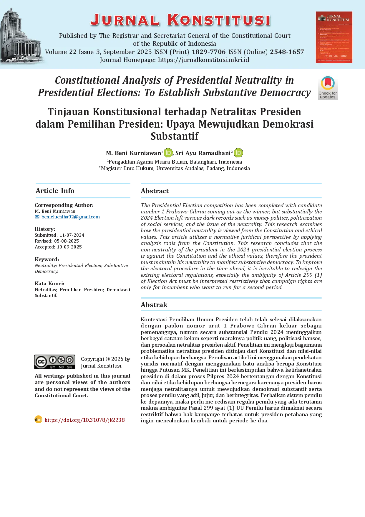 - Constitutional Analysis of Presidential Neutrality in Presidential Elections: To Establish Substantive... jurnalkonstitusi.mkri.id/index.php/jk/article/view/2535Constitutional Analysis of Presidential Neutrality in Presidential Elections To Establish Substantive jurnalkonstitusi mkri index php jk article view 2535