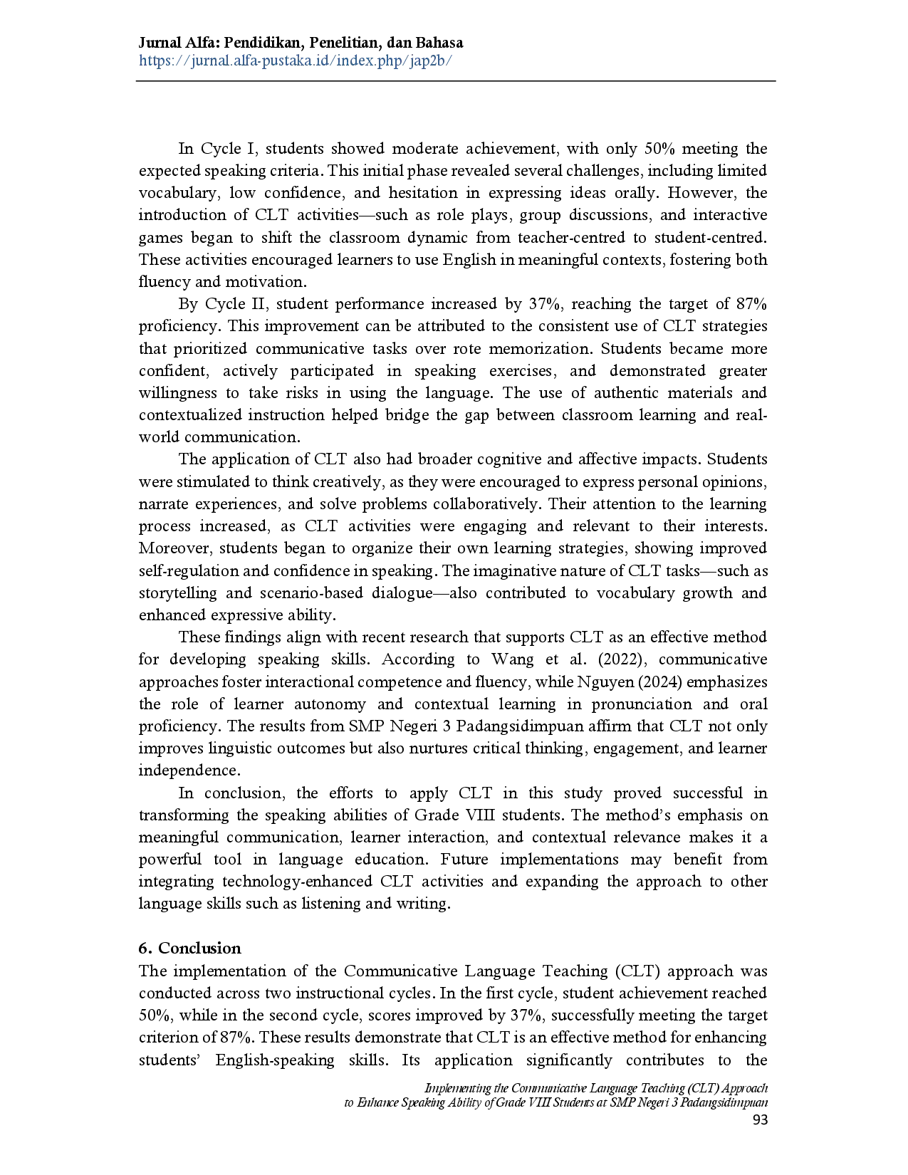 Implementasi pendekatan CLT dilakukan dalam dua siklus penelitian tindakan kelas.Pada siklus pertama, pencapaian siswa mencapai 50%, sementara pada siklus kedua, skor meningkat sebesar 37% dan berhasil mencapai target kriteria 87%.Hasil ini menunjukkan bahwa CLT efektif dalam meningkatkan kemampuan berbicara siswa.Pendekatan ini tidak hanya meningkatkan hasil linguistik tetapi juga mendorong berpikir kritis, keterlibatan, dan kemandirian belajar.Peningkatan kemampuan berbicara siswa terlihat dari peningkatan kepercayaan diri, partisipasi aktif, dan penggunaan bahasa yang lebih percaya diri.