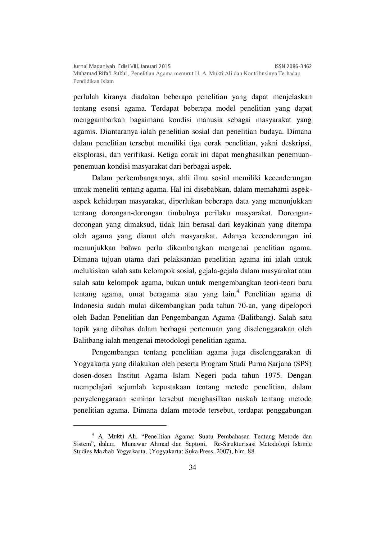 MadaniyahMadaniyahTidak dapat dipungkiri lagi bahwa agama merupakan suatu hal yang dibutuhkan oleh manusia. Dimana agama dijadikan sebagai tolak ukur dan pedoman bagi keberlangsungan hidupnya. Oleh karena itu, sangat diperlukan pelaksanaan tentang penelitian agama yang dapat memberikan kontribusi besar dalam memahami apa itu sebenarnya agama. Di Indonesia sendiri sudah mulai banyak bermunculan penelitian agama, namun hasil-hasilnya kurang memberikan kontribusi dalam memahami tentang apa itu agama. Hal ini diungkapkan oleh H. A. Mukti Ali yang menjelaskan bahwa penelitian agama selama ini tidak menggunakan metode yang tepat dalam pelaksanaannya. Sehingga ia merumuskan sebuah metode yang disebut dengan metode sintesis sebagai jawaban dari kegelisahannya terhadap kekurangan dari penelitian agama selama ini. Melalui metode sintesis yang dikembangkan oleh Mukti Ali ini dapat menelurkan hasil-hasil penelitian yang mutakhir tentang agama, termasuk agama Islam. Karena yang diperoleh bukan saja bersifat doktriner, melainkan juga bersifat ilmiah dalam mengkaji hal ikhwal tentang agama. Dengan demikian, penelitian agama dapat memberikan kontribusi atau sumbangan terhadap berbagai disiplin ilmu yang lain, seperti sosial, budaya, politik, ekonomi, termasuk juga dapat memberikan kontribusi yang besar terhadap pengembangan konsep pendidikan Islam.