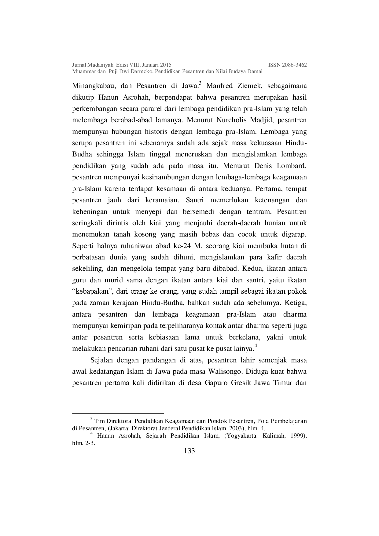 MadaniyahMadaniyahKeanekaragaman suku dan budaya di Indonesia dengan berbagai perbedaan yang melatarbelakanginya acapkali menimbulkan kerawanan sosial dalam kehidupan bermasyarakat. Budaya etnosentris dan primordial sering mengemuka dan mengancam disintegrasi bangsa. Jejak sejarah membuktikan bahwa konflik sosial budaya tersebut sering mengharu biru kehidupan bermasyarakat dan bernegara. Pondok pesantren sebagai salah satu institusi pendidikan asli nusantara pada titik ini mempunyai peran penting bagaimana kehidupan yang damai dapat terwujud. Dengan menampilkan ajaran Islam inklusif dan akhlakul karimah, pesantren mampu memberikan kontribusi nyata dalam kehidupan bermasyarakat yang damai melalui penyebaran dan pengembangan Islam di nusantara. Pada konteks ini, pesantren menjadi salah satu lembaga pendidikan yang mampu membentuk kultur masyarakatnya yang toleran, saling menghargai, dengan tetap berpegang pada ajaran Islam. Nilai-nilai inklusif pendidikan pesantren mampu membuat masyarakat pesantren mempunyai tradisi yang khas. Sistem pendidikan dan tradisi pesantren melahirkan nilai-nilai yang compatible terhadap pembentukan budaya damai.
