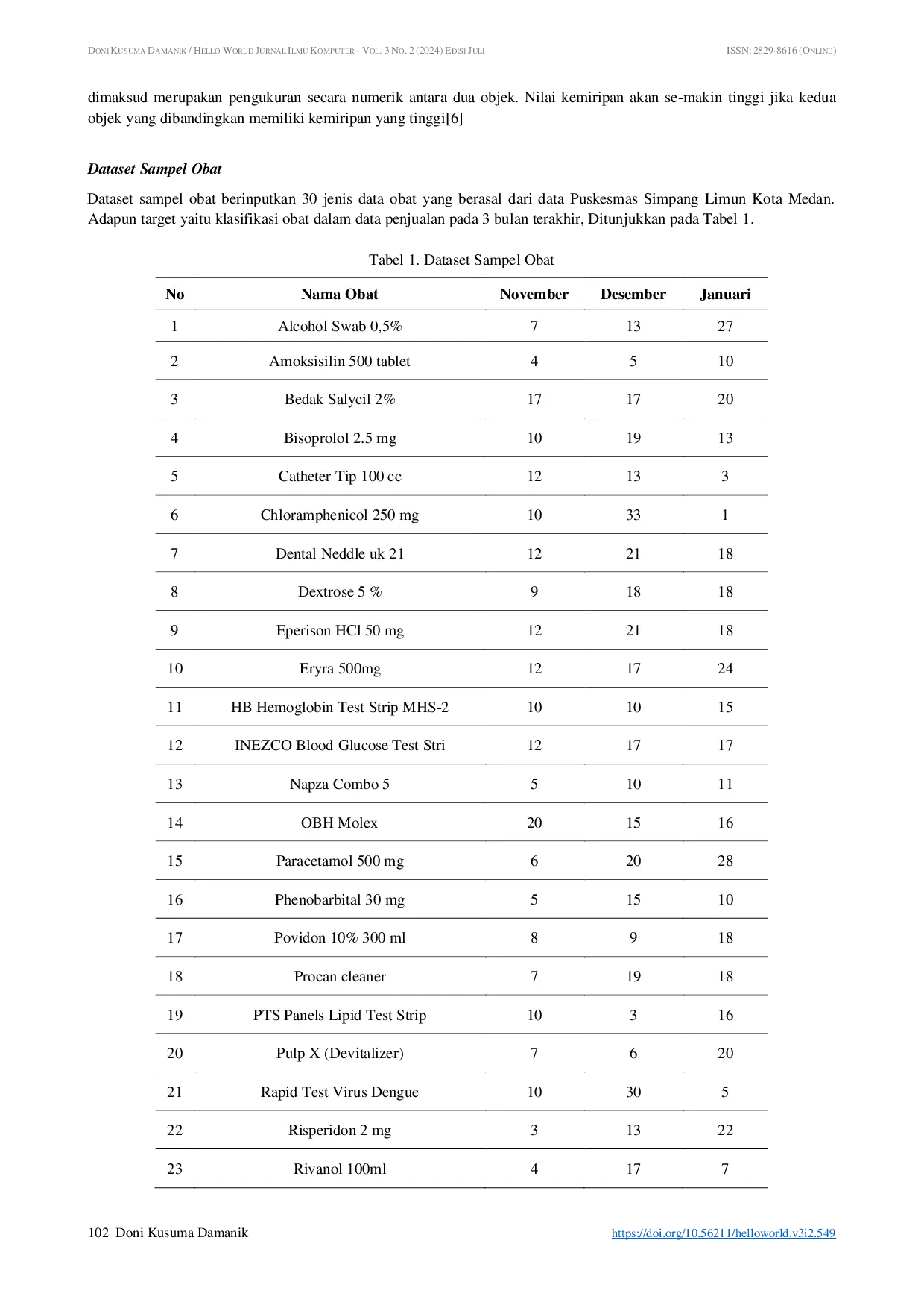 Hello World Jurnal Ilmu KomputerHello World Jurnal Ilmu KomputerPerencanaan kebutuhan obat di puskesmas merupakan salah satu aspek penting dan menentukan dalam pengelolaan obat, dimana dengan perencanaan kebutuhan obat yang tepat akan membuat pengadaan menjadi efektif dan efisien sehingga tersedia obat dengan jenis dan jumlah yang cukup sesuai dengan kebutuhan pelayanan kesehatan dengan mutu yang terjamin serta dapat diperoleh pada saat yang diperlukan. Obat digunakan untuk mencegah dan mengobati penyakit serta mengurangi rasa sakit. Oleh karena itu, obat harus dikelola dengan baik, efisien, dan efektif. Pada penelitian ini menggunakan 30 sampel data. Data mining adalah teknik untuk mengolah data agar dapat menemukan pola tersembunyi. Metode K-Means merupakan metode yang digunakan untuk proses klasterisasi pada data yang digunakan. Hasil dari data mining ini bisa digunakan untuk mengambil keputusan di masa mendatang.