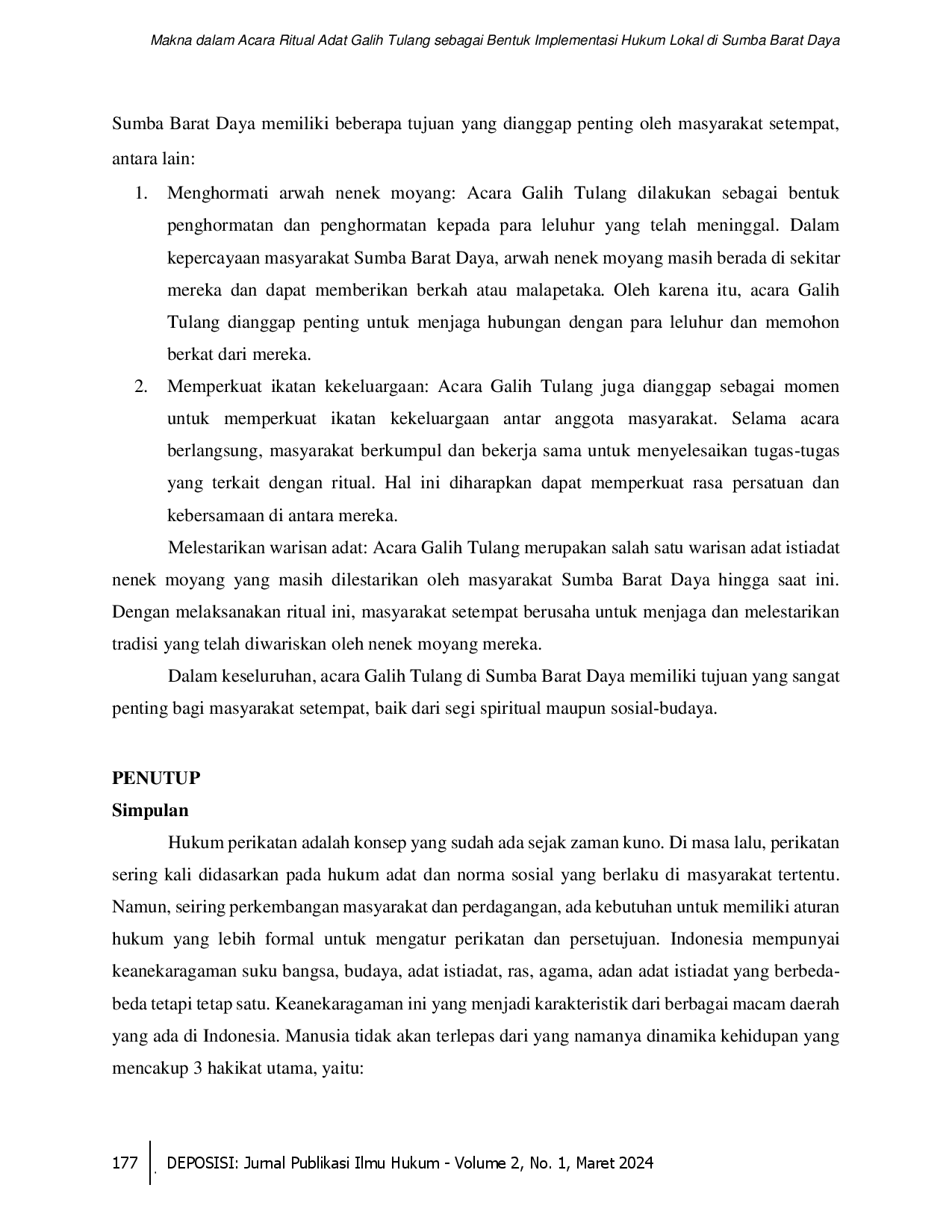 Penelitian ini menunjukkan bahwa konsep hukum perikatan yang bersifat kuno kini dipadukan dengan kebutuhan akan regulasi formal dalam konteks ritual Galih Tulang, yang berfungsi sebagai perwujudan hukum adat di Sumba Barat Daya.Ritual Galih Tulang bukan sekadar upacara simbolis, melainkan merupakan mekanisme hukum tidak tertulis yang memperkuat ikatan kekeluargaan dan memastikan keberlangsungan nilai-nilai budaya.Oleh karena itu, pelestarian ritual ini menjadi krusial untuk menjaga keanekaragaman budaya sekaligus mengintegrasikan nilai-nilai adat ke dalam kerangka hukum nasional.