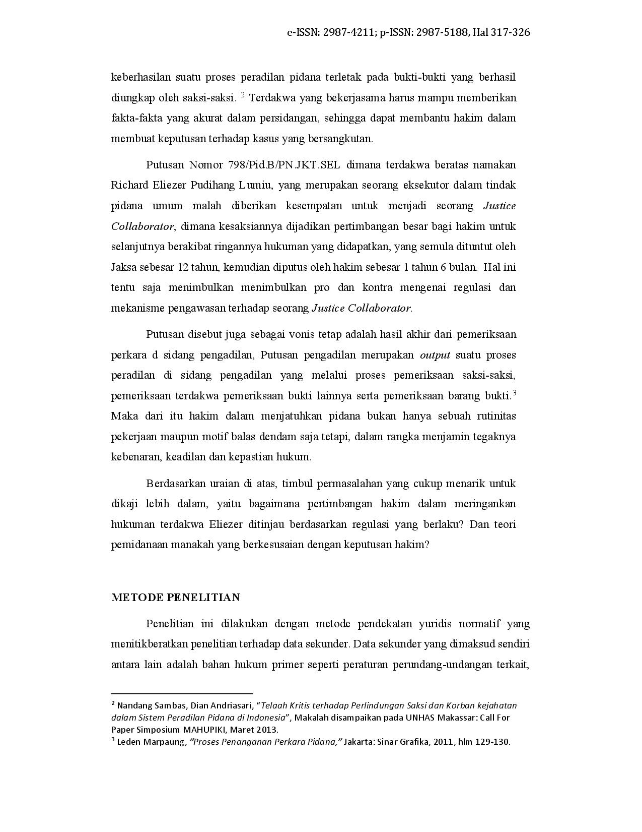 Berdasarkan analisis kasus Richard Eliezer, terdapat beberapa arah penelitian lanjutan yang menarik untuk dieksplorasi. Pertama, perlu dilakukan studi komparatif mengenai penerapan Justice Collaborator di berbagai negara dengan sistem hukum yang berbeda, untuk mengidentifikasi praktik terbaik dan potensi tantangan dalam implementasinya di Indonesia. Kedua, penelitian dapat difokuskan pada pengembangan indikator objektif untuk menilai kelayakan seseorang menjadi Justice Collaborator, guna menghindari subjektivitas hakim dan memastikan keadilan bagi semua pihak. Ketiga, penting untuk meneliti dampak psikologis dan sosial bagi Justice Collaborator setelah menjalani proses hukum, serta merancang program pendampingan yang efektif untuk membantu mereka berintegrasi kembali ke masyarakat.