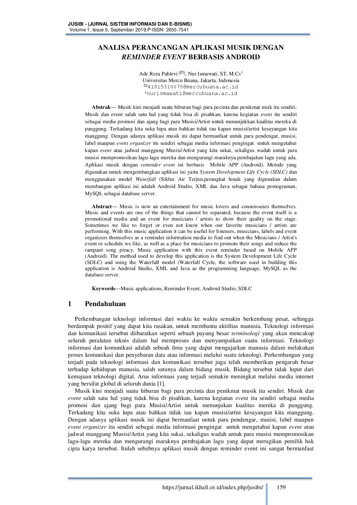 Jurnal Sistem Informasi dan E-BisnisJurnal Sistem Informasi dan E-BisnisMusik kini menjadi suatu hiburan bagi para pecinta dan penikmat musik itu sendiri. Musik dan event salah satu hal yang tidak bisa dipisahkan, karena kegiatan event itu sendiri sebagai media promosi dan ajang bagi para Musisi/Artist untuk menunjukkan kualitas mereka di panggung. Terkadang kita suka lupa atau bahkan tidak tau kapan musisi/artist kesayangan kita manggung. Dengan adanya aplikasi musik ini dapat bermanfaat untuk para pendengar, musisi, label maupun event organizer itu sendiri sebagai media informasi pengingat untuk mengetahui kapan event atau jadwal manggung Musisi/Artist yang kita sukai, sekaligus wadah untuk para musisi mempromosikan lagu-lagu mereka dan mengurangi maraknya pembajakan lagu yang ada. Aplikasi musik dengan reminder event ini berbasis Mobile APP (Android). Metode yang digunakan untuk mengembangkan aplikasi ini yaitu System Development Life Cycle (SDLC) dan menggunakan model Waterfall (Siklus Air Terjun, perangkat lunak yang digunakan dalam membangun aplikasi ini adalah Android Studio, XML dan Java sebagai bahasa pemograman, MySQL sebagai database server.