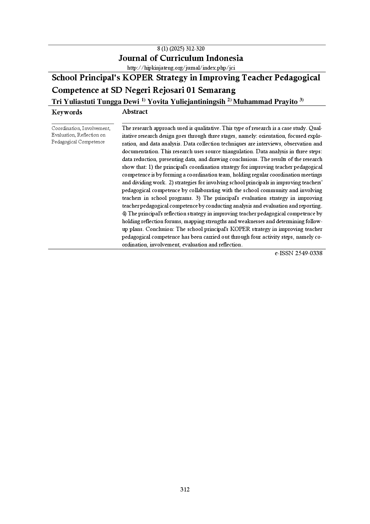 Journal of Curriculum IndonesiaJournal of Curriculum IndonesiaPendekatan penelitian yang digunakan adalah kualitatif. Jenis penelitian ini adalah studi kasus. Desain penelitian kualitatif melalui tiga tahapan, yaitu: orientasi, eksplorasi terfokus, dan analisis data. Teknik pengumpulan data berupa wawancara, observasi, dan dokumentasi. Penelitian ini menggunakan triangulasi sumber. Analisis data dilakukan dalam tiga langkah: reduksi data, penyajian data, dan penarikan kesimpulan. Hasil penelitian menunjukkan bahwa: 1) strategi koordinasi kepala sekolah untuk meningkatkan kompetensi pedagogik guru adalah dengan membentuk tim koordinasi, mengadakan rapat koordinasi secara berkala, dan membagi tugas. 2) strategi keterlibatan kepala sekolah dalam meningkatkan kompetensi pedagogik guru dengan berkolaborasi dengan komunitas sekolah dan melibatkan guru dalam program sekolah. 3) strategi evaluasi kepala sekolah dalam meningkatkan kompetensi pedagogik guru dengan melakukan analisis dan evaluasi serta pelaporan. 4) strategi refleksi kepala sekolah dalam meningkatkan kompetensi pedagogik guru dengan menyelenggarakan forum refleksi, memetakan kekuatan dan kelemahan, serta menentukan rencana tindak lanjut.