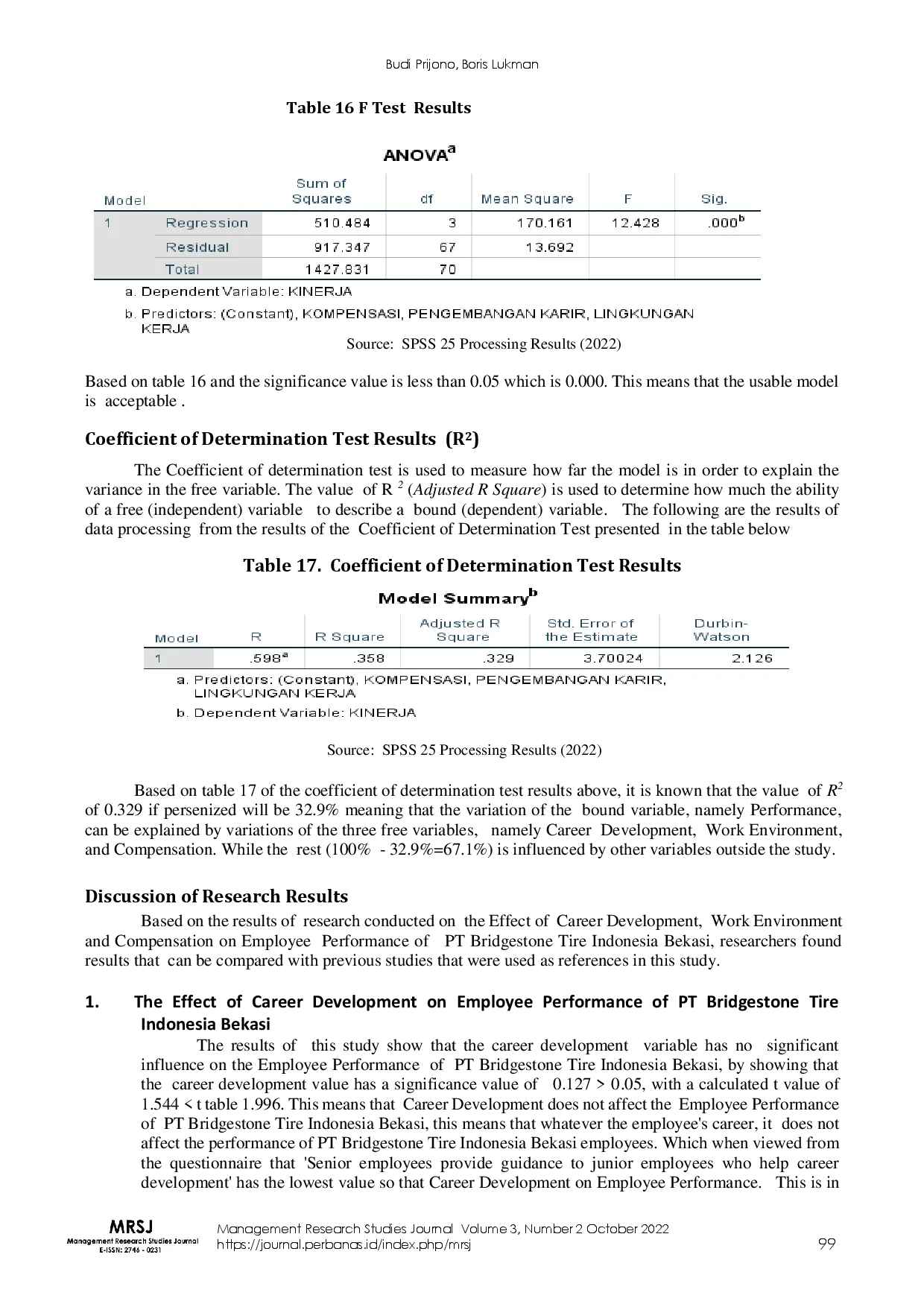 Management Research Studies JournalManagement Research Studies JournalThis study aims to analyze the effect of career development, work environment and compensation on the performance of PT Bridgestone Tire Indonesia Bekasi employees. The independent variables used are career development, work environment and compensation while the dependent variables of this study are employee performance. This research method uses quantitative methods with a total sample of 71 respondents. The analysis technique used in the study is a regression test. The results of this study can be concluded that the variables of career development and work environment do not have a significant effect on employee performance, while the compensation variable has a significant effect on employee performance.