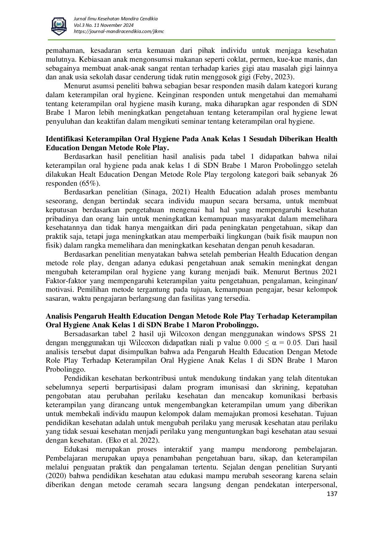 Jurnal Ilmiah Kesehatan Mandira CendikiaJurnal Ilmiah Kesehatan Mandira CendikiaKesehatan gigi dan mulut pada anak dapat merefleksikan kesehatan tubuh secara keseluruhan, termasuk jika terjadi kekurangan nutrisi dan gejala penyakit lain di tubuh. Sehingga pada kasus ini diperlukan Health Education dengan Role Play. Penelitian ini bertujuan untuk mengetahui apakah ada pengaruh Health Education dengan metode role play terhadap keterampilan oral hygiene anak. Jenis penelitian ini pre-experiment dengan pendekatan pretest-posttest. Populasi sebanyak 40 siswa, dengan penentuan sampel menggunakan teknik total sampling sesuai kriteria inklusi dan eksklusi. Instrumen yang digunakan adalah lembar observasi keterampilan oral hygiene melalui proses editing, coding, scoring, dan tabulating. Data yang diperoleh dianalisis menggunakan uji Wilcoxon. Hasil penelitian menunjukkan keterampilan oral hygiene sebelum intervensi mayoritas berada dalam kategori kurang, yaitu sebanyak 22 siswa (55%), sedangkan setelah intervensi mayoritas berada dalam kategori baik, yaitu sebanyak 26 siswa (65%). Nilai p pada uji Wilcoxon adalah 0,000. Disimpulkan bahwa terdapat . Metode ini mampu mengembangkan inovasi dan kreativitas siswa sehingga pembelajaran berlangsung secara efektif dan menyenangkan, serta tidak memberatkan responden.