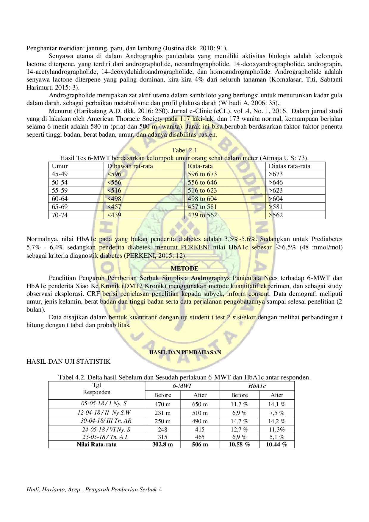 Analisis statistik menunjukkan bahwa nilai p (>0,05) tidak signifikan, sehingga hipotesis nol diterima dan hipotesis alternatif ditolak.Pemberian serbuk simplisia Andrographys paniculata tidak menghasilkan peningkatan signifikan pada hasil 6-MWT maupun penurunan HbA1c pada penderita Xiao Ke kronik.Dengan demikian, intervensi tersebut tidak cukup efektif dan efisien dalam meningkatkan kapasitas berjalan atau mengontrol glikemia pada pasien DMT2 kronik.