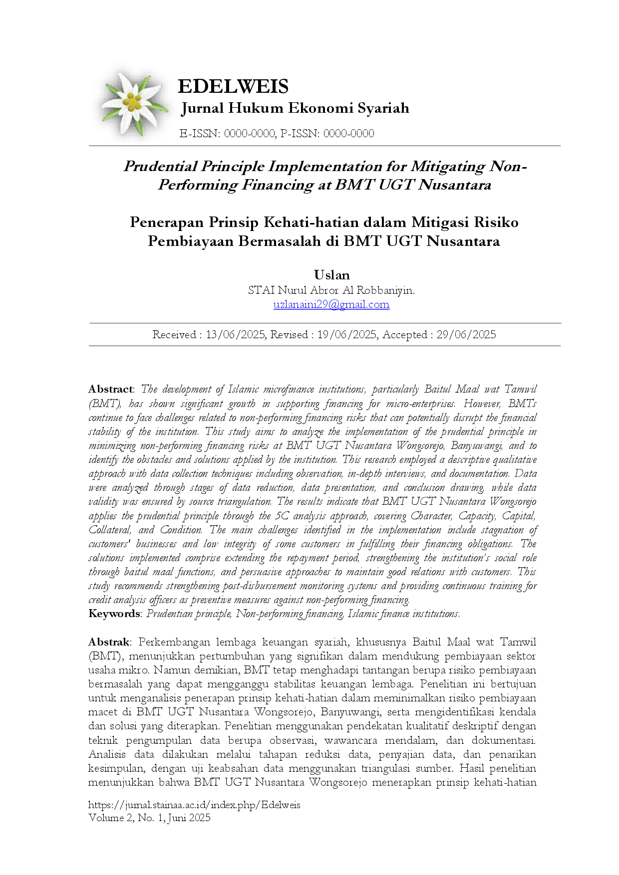 EDELWEIS : Jurnal Hukum Ekonomi SyariahEDELWEIS : Jurnal Hukum Ekonomi SyariahPerkembangan lembaga keuangan syariah, khususnya Baitul Maal wat Tamwil (BMT), menunjukkan pertumbuhan yang signifikan dalam mendukung pembiayaan sektor usaha mikro. Namun demikian, BMT tetap menghadapi tantangan berupa risiko pembiayaan bermasalah yang dapat mengganggu stabilitas keuangan lembaga. Penelitian ini bertujuan untuk menganalisis penerapan prinsip kehati-hatian dalam meminimalkan risiko pembiayaan macet di BMT UGT Nusantara Wongsorejo, Banyuwangi, serta mengidentifikasi kendala dan solusi yang diterapkan. Penelitian menggunakan pendekatan kualitatif deskriptif dengan teknik pengumpulan data berupa observasi, wawancara mendalam, dan dokumentasi. Analisis data dilakukan melalui tahapan reduksi data, penyajian data, dan penarikan kesimpulan, dengan uji keabsahan data menggunakan triangulasi sumber. Hasil penelitian menunjukkan bahwa BMT UGT Nusantara Wongsorejo menerapkan prinsip kehati-hatian melalui pendekatan analisis 5C, yaitu Character, Capacity, Capital, Collateral, dan Condition. Adapun kendala utama dalam implementasinya meliputi stagnasi usaha nasabah dan rendahnya integritas sebagian nasabah dalam memenuhi kewajiban pembiayaan. Solusi yang diterapkan meliputi perpanjangan jangka waktu angsuran, penguatan peran sosial lembaga melalui fungsi baitul maal, serta pendekatan persuasif dan silaturahmi kepada nasabah. Penelitian ini merekomendasikan penguatan sistem monitoring pembiayaan dan pelatihan berkelanjutan bagi petugas analisis risiko sebagai upaya preventif terhadap pembiayaan bermasalah.