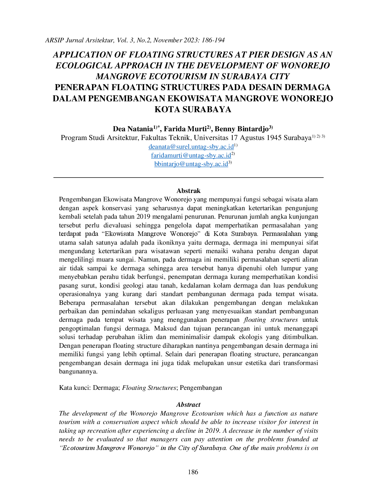 Arsitektur Universitas Pandanaran JurnalArsitektur Universitas Pandanaran JurnalPengembangan Ekowisata Mangrove Wonorejo yang mempunyai fungsi sebagai wisata alam dengan aspek konservasi yang seharusnya dapat meningkatkan ketertarikan pengunjung kembali setelah pada tahun 2019 mengalami penurunan. Penurunan jumlah angka kunjungan tersebut perlu dievaluasi sehingga pengelola dapat memperhatikan permasalahan yang terdapat pada “Ekowisata Mangrove Wonorejo di Kota Surabaya. Permasalahan utama salah satunya adalah pada ikoniknya yaitu dermaga, yang memiliki sifat mengundang ketertarikan para wisatawan seperti menaiki wahana perahu, namun memiliki masalah aliran air tidak sampai ke dermaga, penempatan tidak memperhatikan pasang surut, kondisi geologi, kedalaman kolam, dan luas pendukung operasional yang kurang standar. Perbaikan dan pemindahan dermaga serta perluasan dengan penerapan floating structures diusulkan untuk mengoptimalkan fungsi dermaga, menjawab perubahan iklim, dan meminimalisir dampak ekologi.
