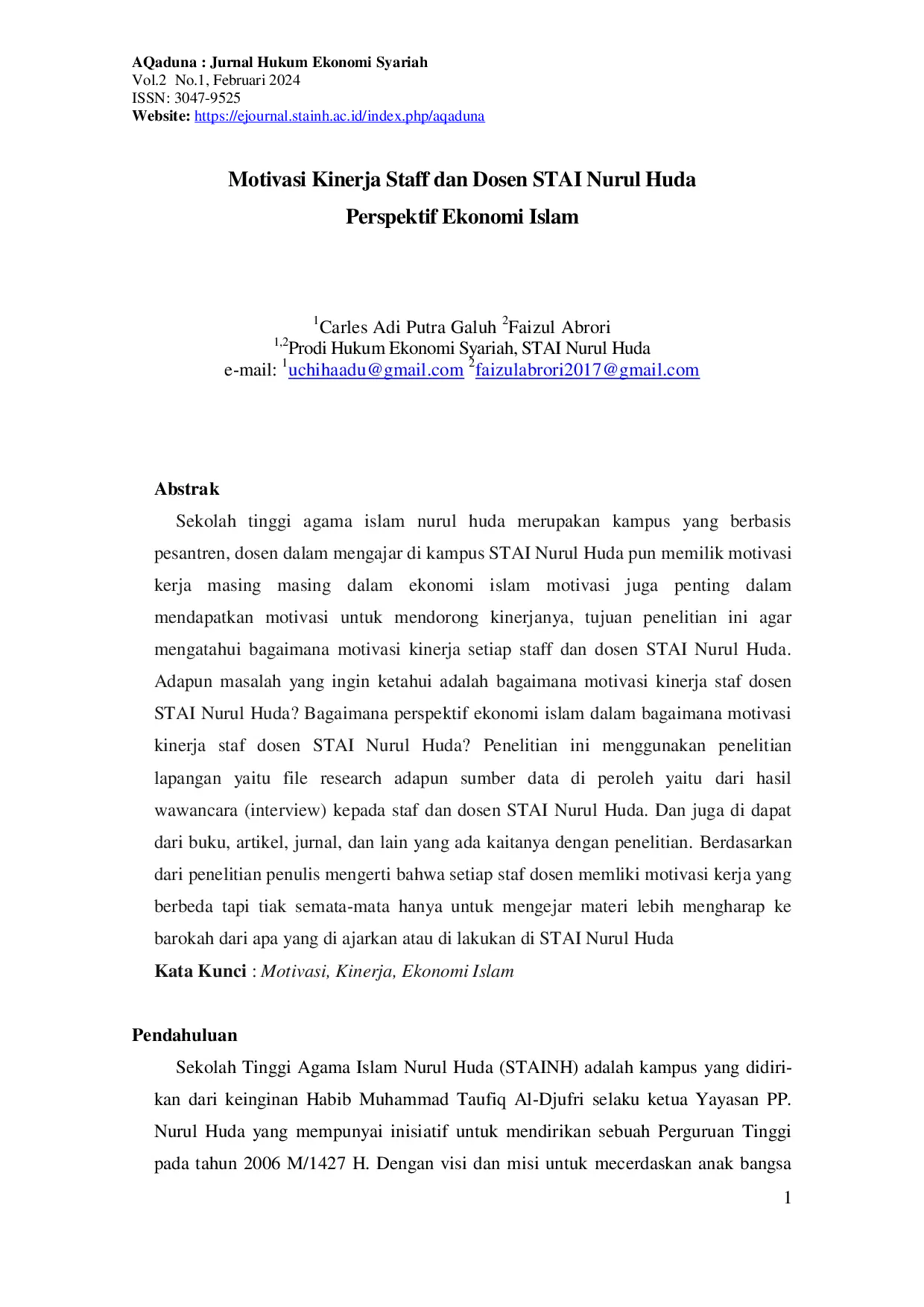 AQaduna : Jurnal Hukum Ekonomi SyariahAQaduna : Jurnal Hukum Ekonomi SyariahSekolah Tinggi Agama Islam Nurul Huda merupakan kampus yang berbasis pesantren, dosen dalam mengajar di kampus STAI Nurul Huda memiliki motivasi kerja masing-masing. Dalam ekonomi Islam, motivasi juga penting dalam mendapatkan dorongan untuk mendorong kinerjanya. Tujuan penelitian ini adalah untuk mengetahui bagaimana motivasi kinerja setiap staff dan dosen STAI Nurul Huda. Adapun masalah yang ingin diketahui adalah bagaimana motivasi kinerja staf dosen STAI Nurul Huda? Bagaimana perspektif ekonomi Islam dalam motivasi kinerja staf dosen STAI Nurul Huda? Penelitian ini menggunakan penelitian lapangan yaitu field research, adapun sumber data yang diperoleh dari hasil wawancara (interview) kepada staf dan dosen STAI Nurul Huda, serta dari buku, artikel, jurnal, dan lainnya yang berkaitan dengan penelitian. Berdasarkan penelitian, penulis memahami bahwa setiap staf dosen memiliki motivasi kerja yang berbeda, namun tidak semata-mata hanya untuk mengejar materi, melainkan lebih mengharapkan keberkahan dari apa yang diajarkan atau dilakukan di STAI Nurul Huda.