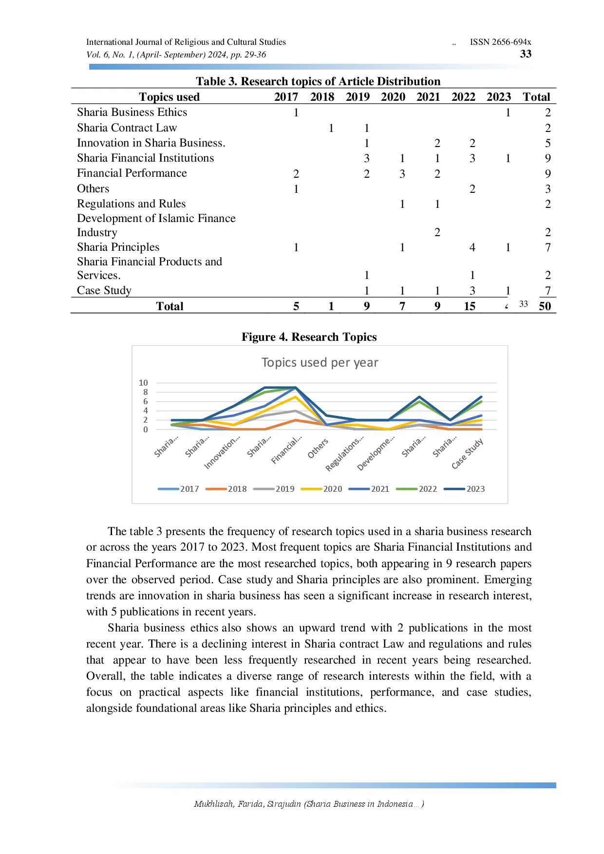 Fluktuasi jumlah artikel tentang bisnis syariah menunjukkan sifat dinamis bidang ini.Peningkatan signifikan pada 2022 mencerminkan minat yang meningkat terhadap praktik bisnis syariah.Peneliti, pembuat kebijakan, dan praktisi perlu terus bekerja sama untuk mengatasi tantangan dan peluang yang ada.Pendekatan kualitatif dan kuantitatif yang seimbang memungkinkan penelitian yang komprehensif.Dominasi bisnis perbankan syariah menunjukkan pentingnya keuangan Islam dalam bidang ini.Peneliti dan pemangku kepentingan harus terus mengeksplorasi topik seperti kinerja keuangan, prinsip syariah, dan studi kasus untuk memperdalam pemahaman tentang bisnis syariah.