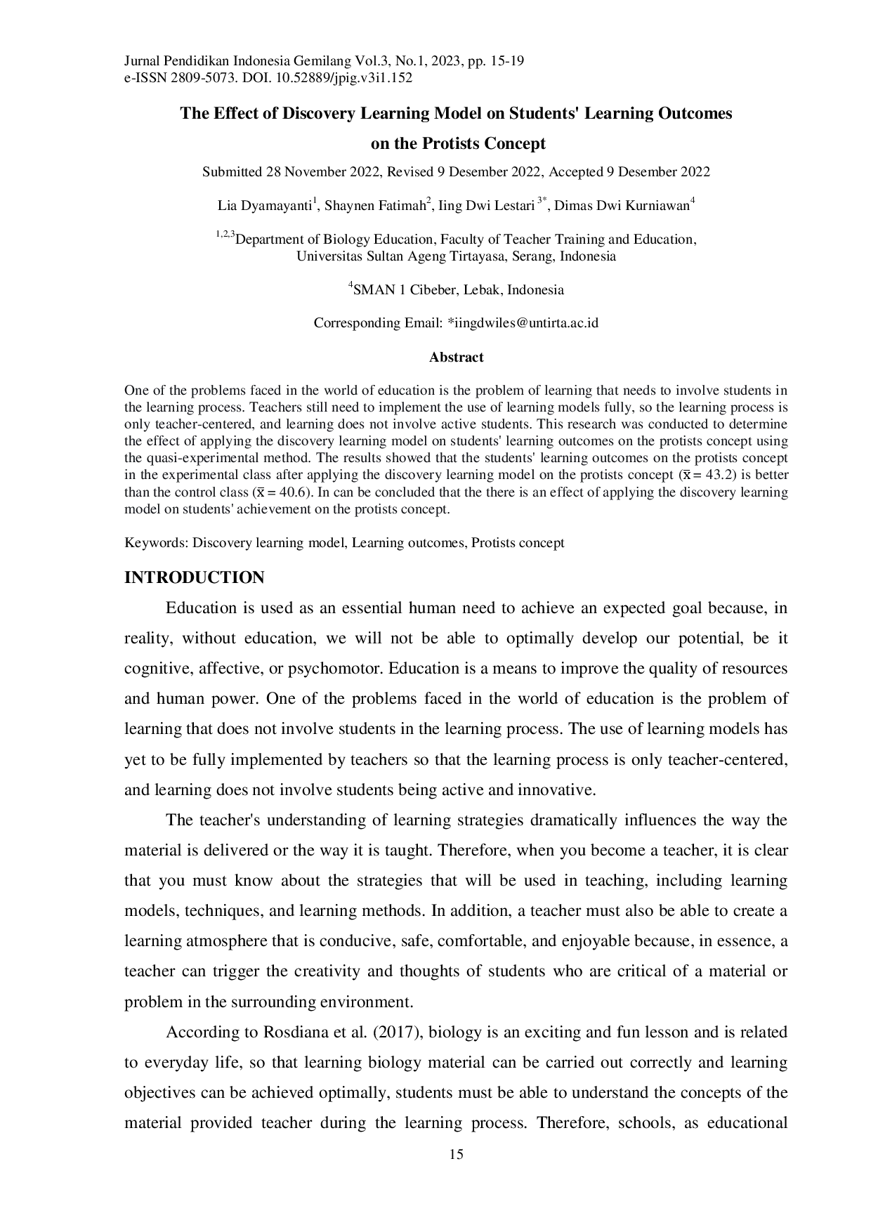Jurnal Pendidikan Indonesia GemilangJurnal Pendidikan Indonesia GemilangPenelitian ini bertujuan untuk mengetahui pengaruh penerapan model pembelajaran discovery learning terhadap hasil belajar siswa pada konsep protista menggunakan metode kuasi-eksperimen. Hasil penelitian menunjukkan bahwa hasil belajar siswa pada konsep protista di kelas eksperimen setelah penerapan model discovery learning (̅ = 43.2) lebih baik daripada kelas kontrol (̅ = 40.6). Dapat disimpulkan bahwa terdapat pengaruh penerapan model discovery learning terhadap pencapaian hasil belajar siswa pada konsep protista.
